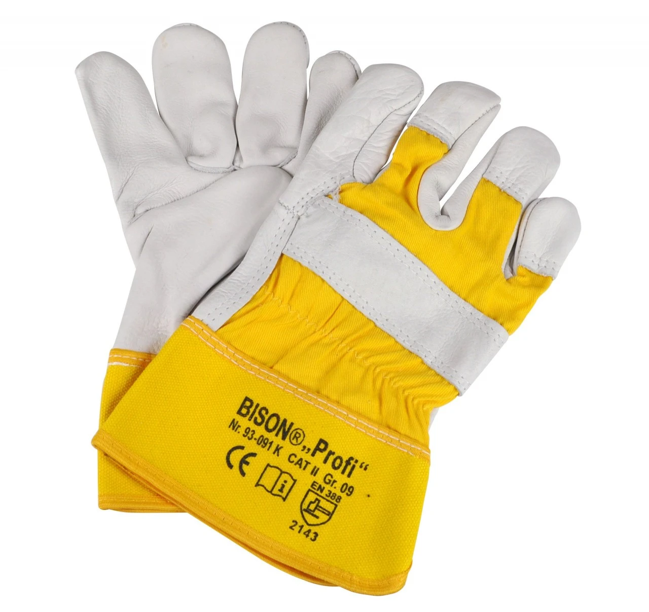 Bison “Profi”, i hht. EN 420 og 388, kat. 2, ufarvet okselæder, i en god kvalitet. Dobbeltsyet med polyester-tråd. Pegefinger er helt af læder. Kraftig manchet. Bomuldsfoer. Længde ca. 270 mm.