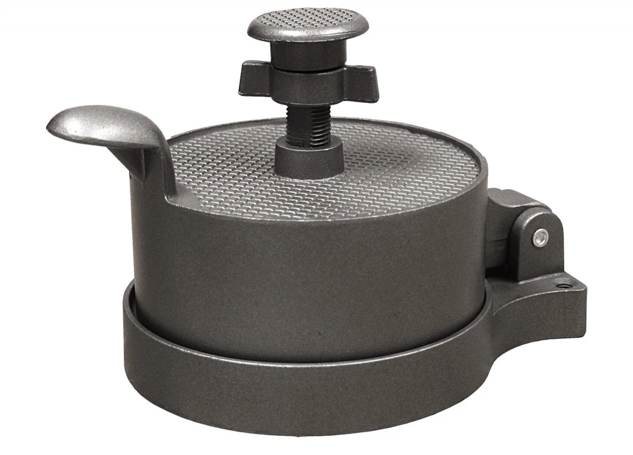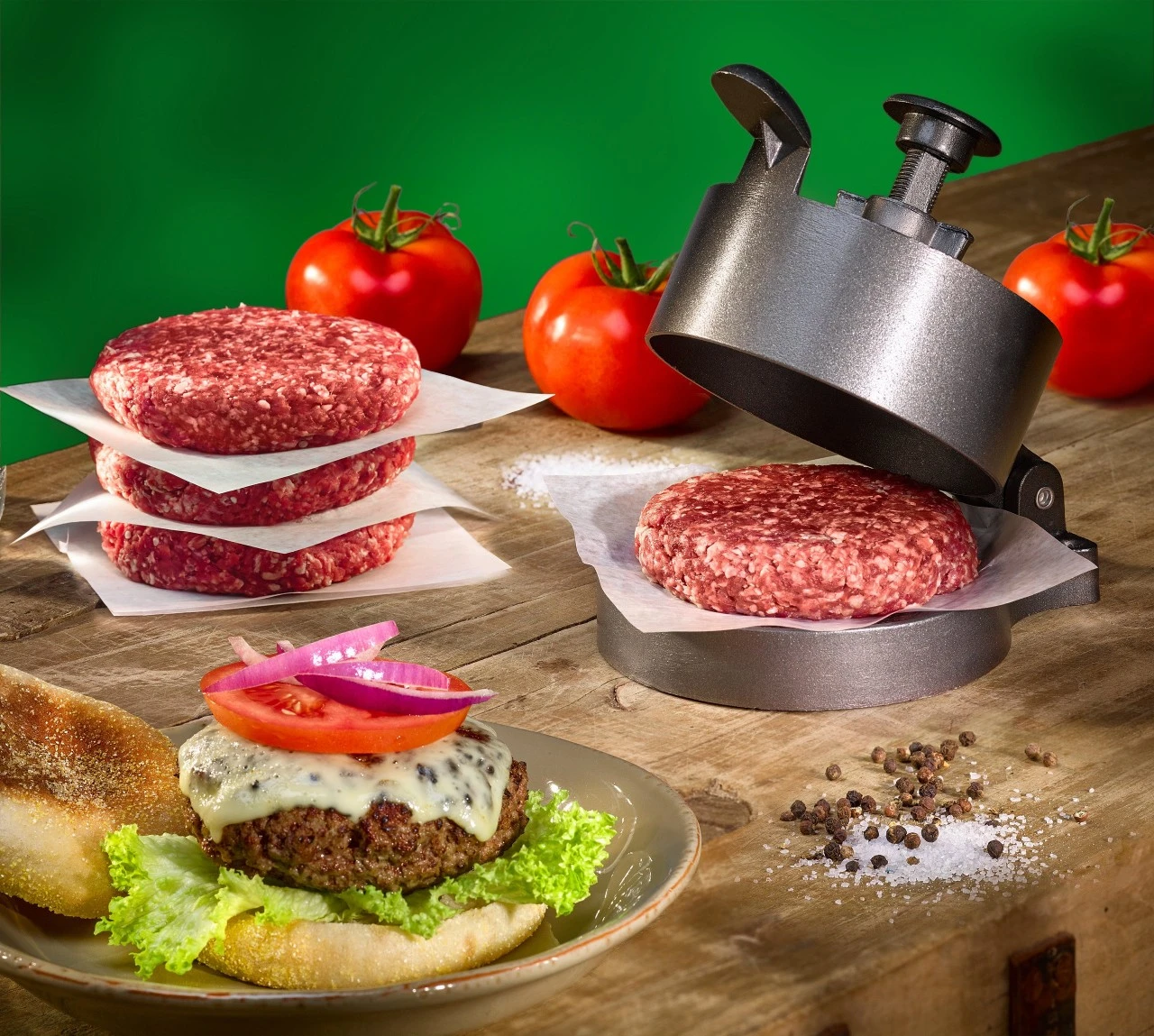 Bare lækkert! Saftige burgere af f.eks. hakket hjorte-, hind- eller vildsvinekød til pande eller grill – intet problem med denne burgerpresse. Indstil den ønskede burgertykkelse, læg hakkekød i formen, luk låget og tryk ned. 12 cm Ø og 0,6 til 3,8 cm tykkelse, alt efter smag og behag. Af robust aluminium, non-stick-coated. Vægt 640 g.