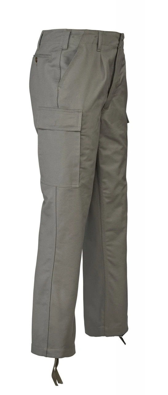 De åndbare og fugtabsorberende BW-arbejdsbukser er lavet af gennemprøvet, stærkt Rips-Moleskin (300 g / m²) i henhold til de tekniske leveringsbetingelser (TL) fra Bundeswehr. Den har kommer med fold, to cargolommer, to sidelommer og en baglomme med knap. Benenden kan justeres. Leveres uden bælte.