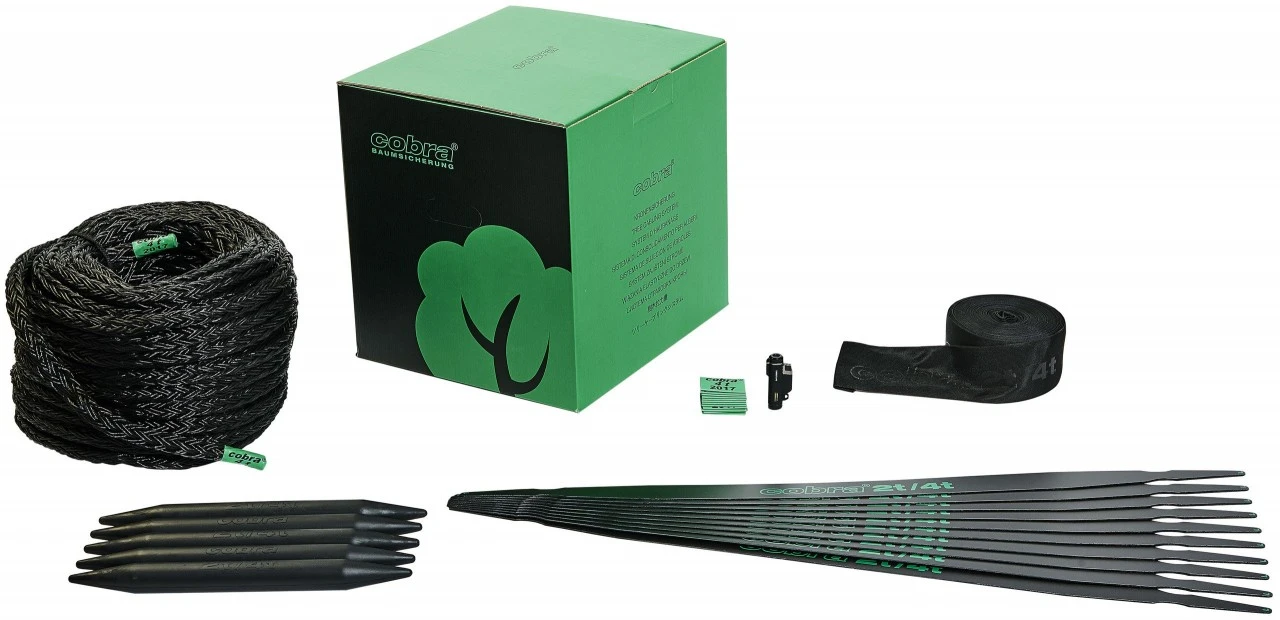 Det 4 t Cobra komplette sæt indeholder nok materiale til 5 dynamiske sikringer. Det eneste, du har brug for til installationen, er en saks. I henhold til ZTV-træpleje er Cobra 4 t-kronesikringssystemet velegnet til grene og træstammer med en diameter fra 40 til 60 cm. Producenten garanterer det minimale systembrudstyrke over 12 år. Uden rykdæmper kan systemet bruges op til en diameter på 40 cm.