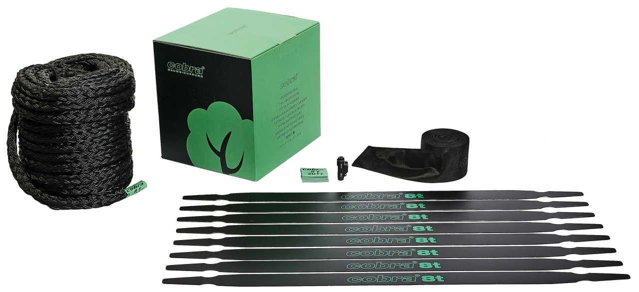 Cobra komplet sæt 8 t indeholder nok materiale til 4 statisk belastning eller beskadigelse af brud. Det eneste, du har brug for til installationen, er en saks. I henhold til ZTV-træpleje er Cobra 8 t-kronesikringssystemet velegnet til grene og træstammer med en diameter på 40 til 60 cm. Producenten garanterer det minimale systembrudstyrke over 8 år. En rykdæmper er ikke påkrævet til statisk brudbeskyttelse.