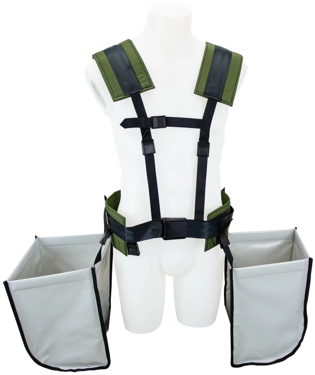 Med justerbare, polstrede skulderremme, 2 kraftige sække og ca. 104 cm langt bælte. Skulderremmene er krydset på ryggen således at de bliver på skulderen.