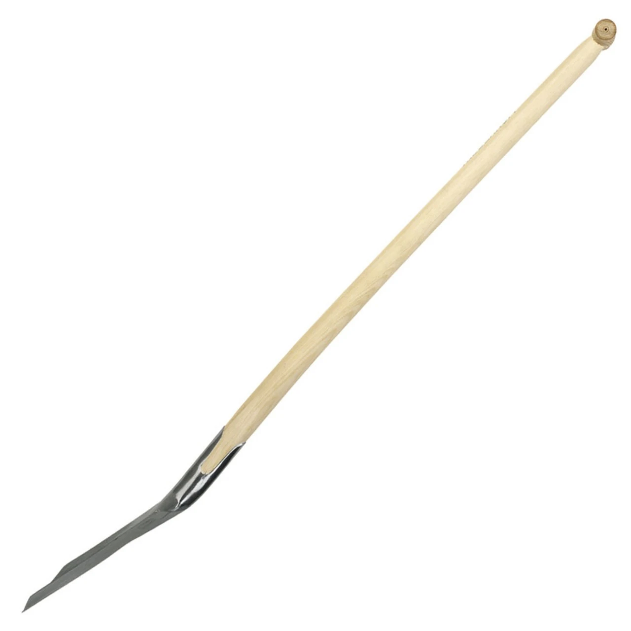 God spade til daglig brug. Med askeskaft og T-håndtag, diameter 40 mm, blad af specialstål, oliehærdet. Længde 1200 mm, bladmål 175/195 mm x 285 mm, vinklet 65 mm. Vægt 1800 g.