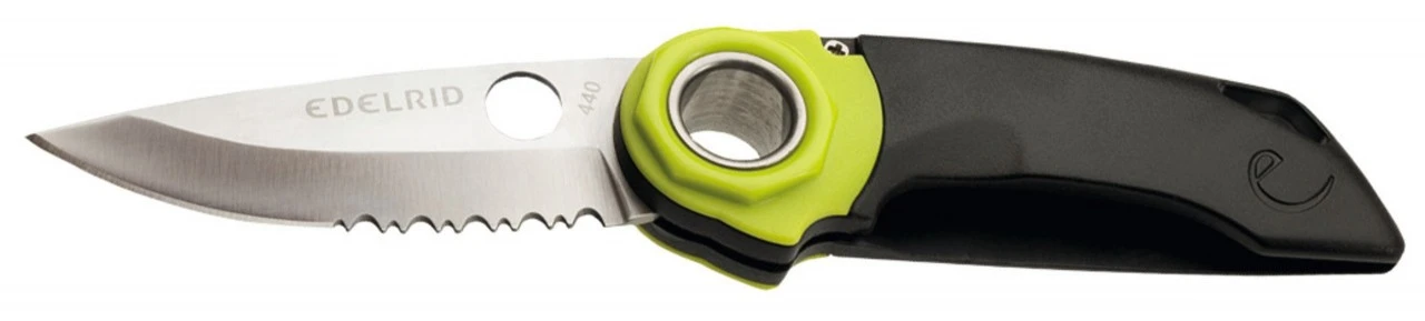 Udviklet specielt til træklatrere. Med en meget skarp, delvist savtakket låsbar klinge, kan reb og bælter i nødstilfælde skæres over. Nem at fastgøre til bælte med en karabin. Klinge længde 70 mm. Vægt 47 g.