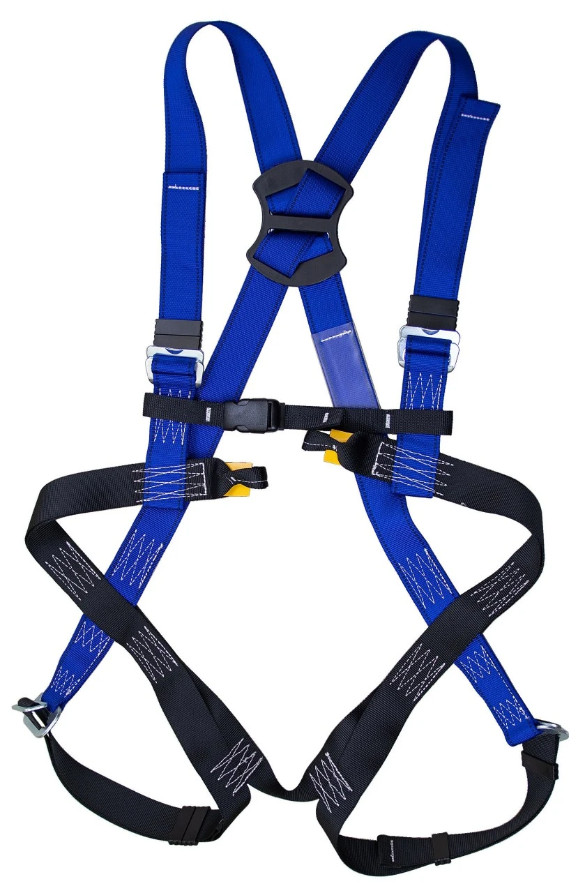 Faldsikringsselen iht. EN 361 leveres i en universel størrelse og kan justeres ved hjælp af friktionsspænder. Selen er forsynet med faldsikringsslynger i brystområdet og en rygplade med faldsikringsøje.
