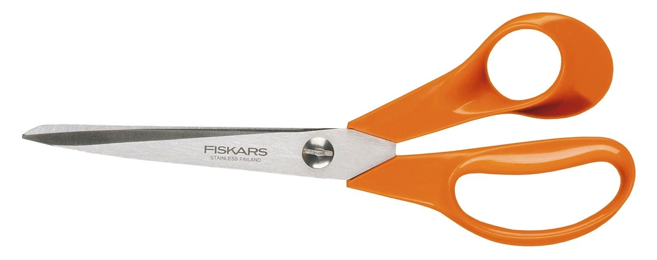 Universalsaksen fra Fiskars med det markante greb i orange bør ikke mangle i nogen husholdning. Med den kan du klare meget forskelligt klippearbejde. Også perfekt på kontoret eller i skolen. Klingespændingen kan indstilles med en skrue. Takket være klingen af rustfrit stål er Fiskars-universalsaks rustfri. Fås som både højrehånds eller venstrehåndssaks, og denne model har i over fire årtier været en populær klassiker. Vægt 95 g.