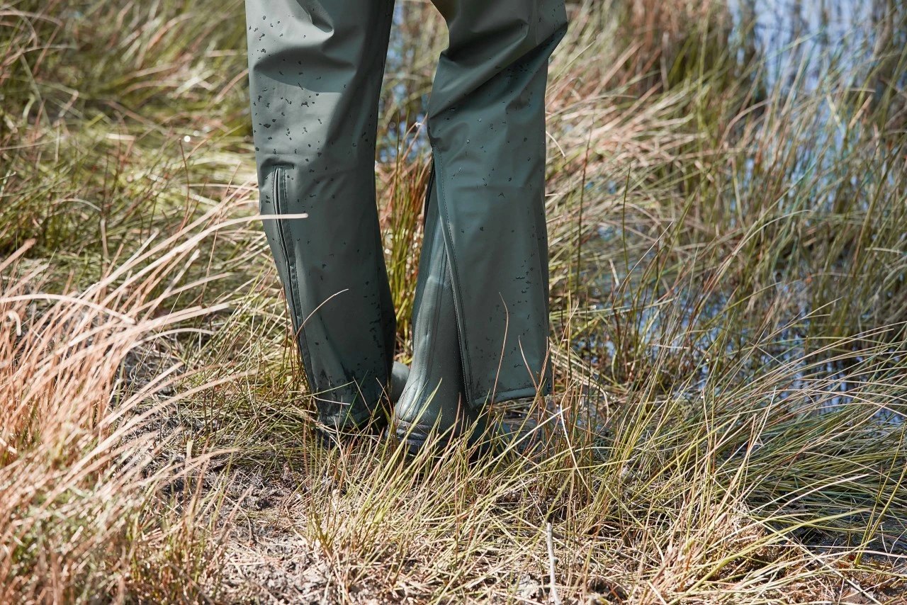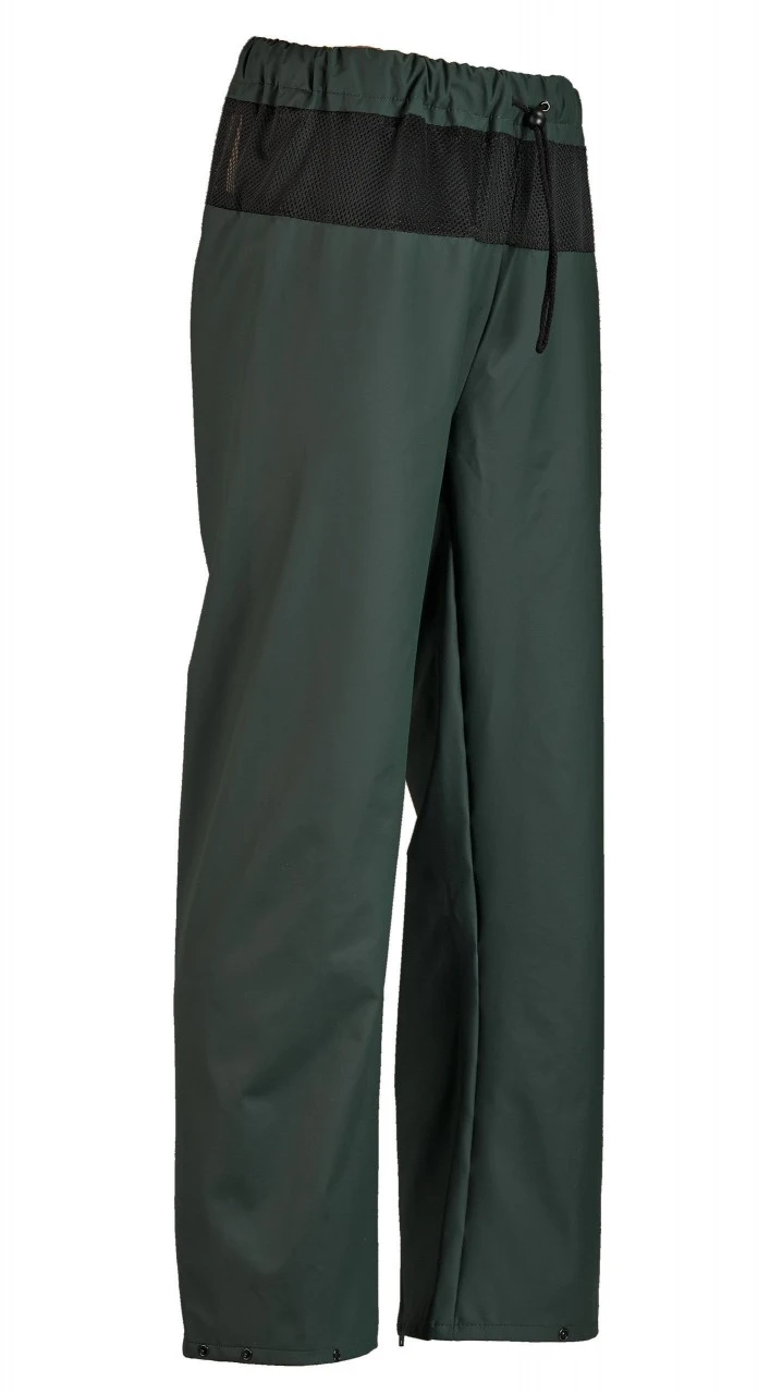 Flexorain-buks til vådt vejr med mekanisk ventilation. Nettet, der er indsat i linningen, giver luften mulighed for at cirkulere. Et generøst snit, en blød, elastisk linning med løbebånd med fastgørelse og lynlås i benenden, der øger komforten og gør dem lettere at tage på.