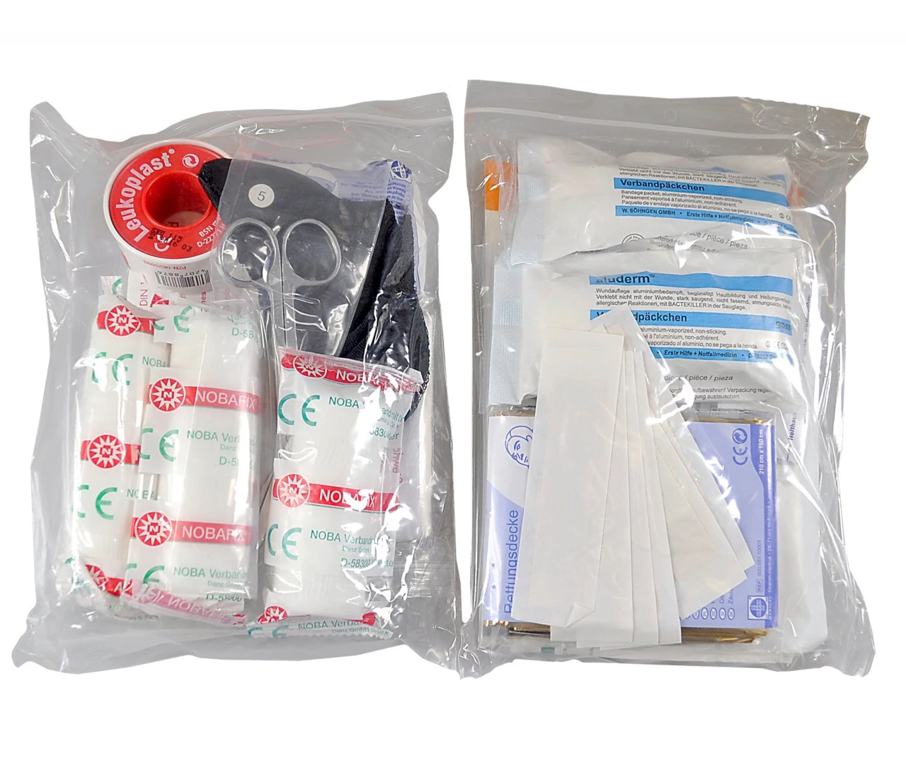 I samarbejde med østrigske fagfolk er der blevet sammensat denne førstehjælpspakke specielt til skovarbejdere. Den består af en orange taske med plaster, trekant-klæde, gazebind, kompresbind, redningstæppe, saks, handsker. Mål: 210 x 140 x 60 mm.