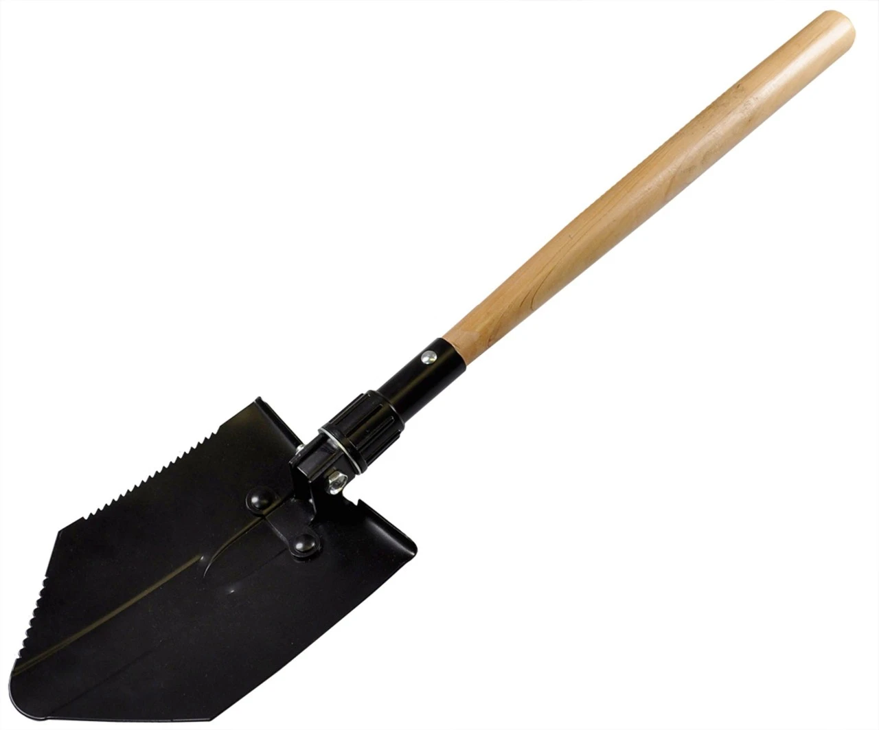 Med træskaft og beskyttelsestaske. Praktisk, handy, kan bruges som spade eller hakke. Ideel som universalspade i køretøjet. Hjælper hvis man kører fast i mudder eller sne og fylder ikke meget i bagagerummet.