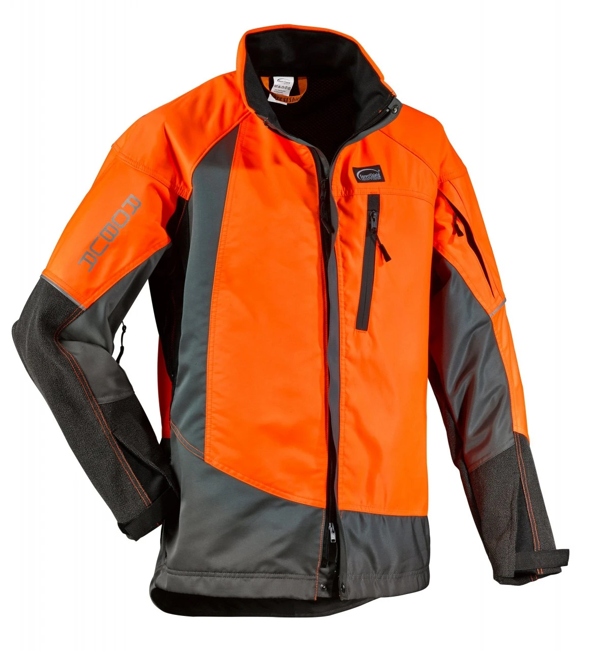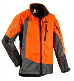 Åndbar kvalitets arbejdsjakke . Afdækket 2-vejs lynlås. Forlænget rygstykke som beskytter overgangen fra jakke til bukser, mod kulde. 2 forlommer , en brystlomme og indstillelig ærmeafslutning med velcro luk. Udluftningshuller i rygdel og armhuler. Lys orange partier på for- og rygside. Reflekterende 3M striber på ærmer og ryg. Kevlar forstærkede ærmer. 100 % Polyester. Vægt ca. 450 g.