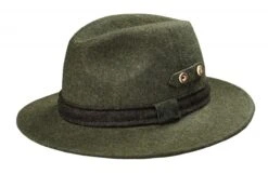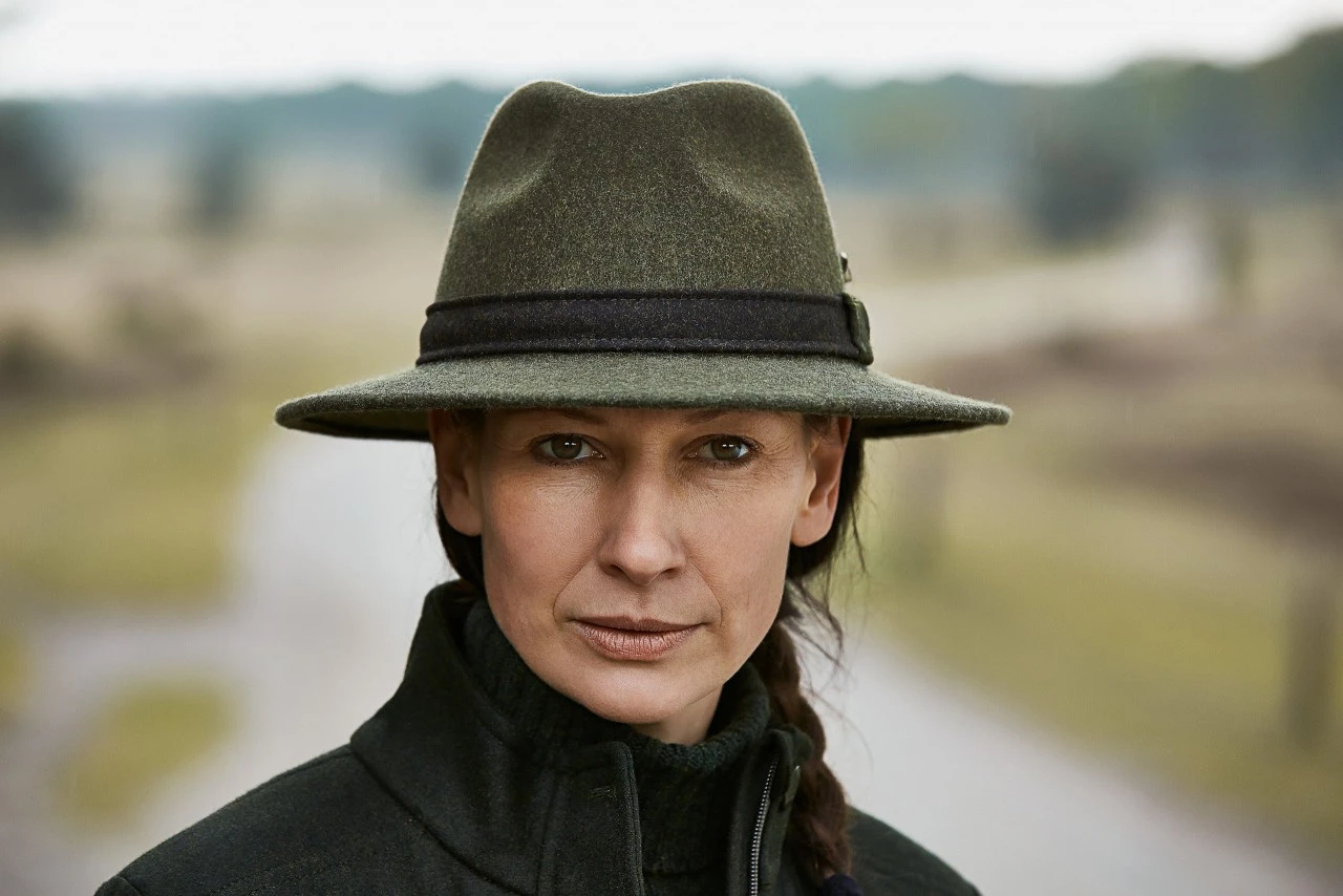 Hatten er lavet af tyk, vandafvisende uldfilt med en bred kant, loden-trim og knapper i imiteret hjortegevir, der passer lige godt til både mænd og kvinder.