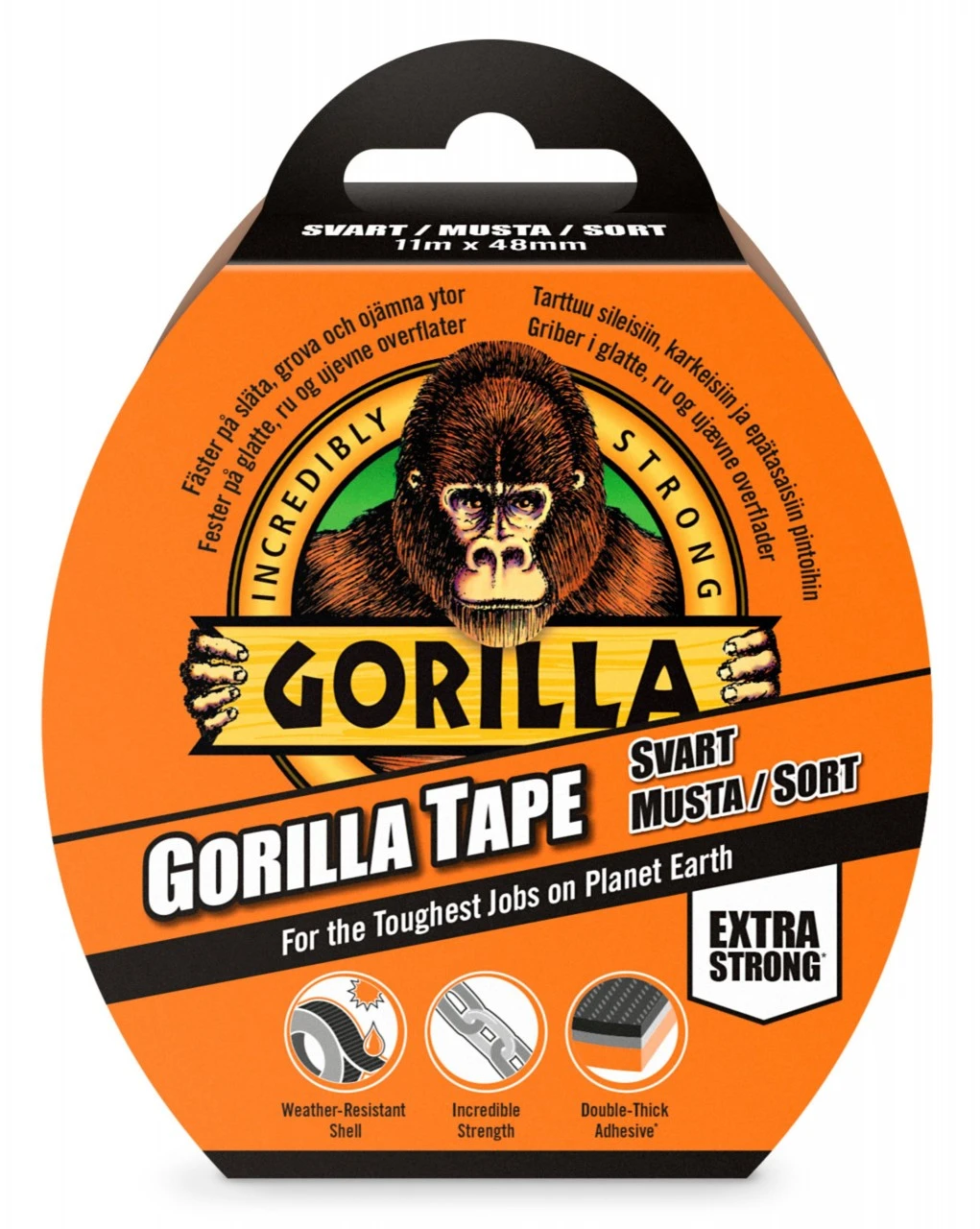 Der er ingen tape svarende til denne. Gorilla tape er den ekstra stærke tape til indendørs og udendørs jobs. Den er stærk og forstærket, men kan stadig trækkes uden brug af saks. tapen binder til ru, ujævne, uplacerbare overflader som træ, sten,mursten og meget mere. Gorilla tape har en holdbar overflade, der kan modstå al slags vejr. Overfladen skaber en tæt barriere, der modstår fugt, UV-stråler og ekstreme temperaturer. Bagsiden af båndet er forstærket med ekstra tæt væv. Endelig er klæbemidlet på båndet dobbelt så tykt som på traditionelle sølv bånd og fylder hullet på ru, ujævne overflader og giver et super stærkt greb.