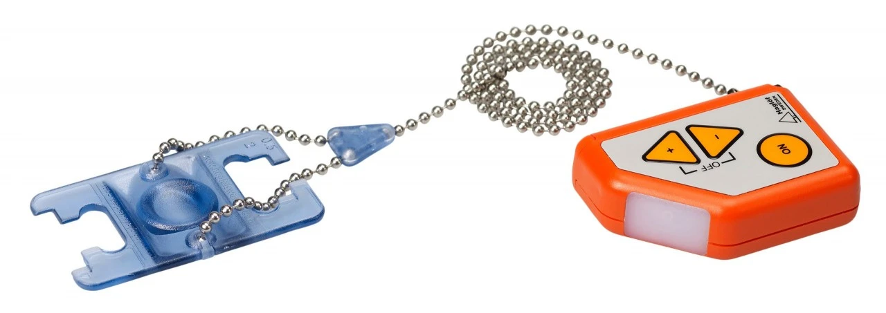 - Faktormåler: gennemsigtig plast, tommelfingergreb, skrå, 60 cm kæde lavet af metal