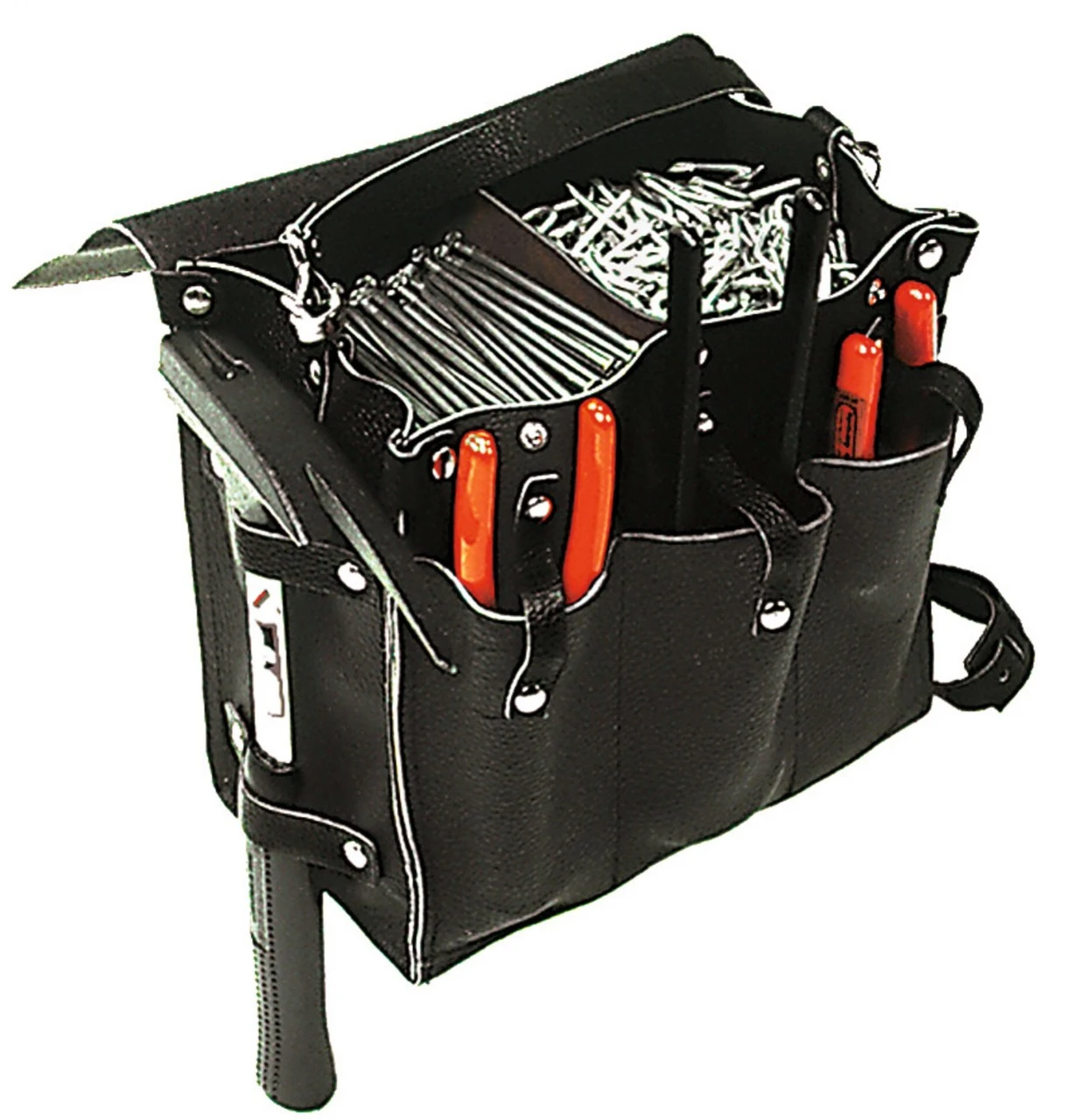 Slut med at løbe frem og tilbage – alt lige ved hånden til slå lægter på eller hæfte tagpap. Af sort kvalitetslæder fra hornkvæg. Udførelse: todelt inderrum, løkker til hamre, tre lommer til tænger og skulderrem. Mål: 250 x 250 x 140 mm, vægt 1180 g. Leveres uden indhold.