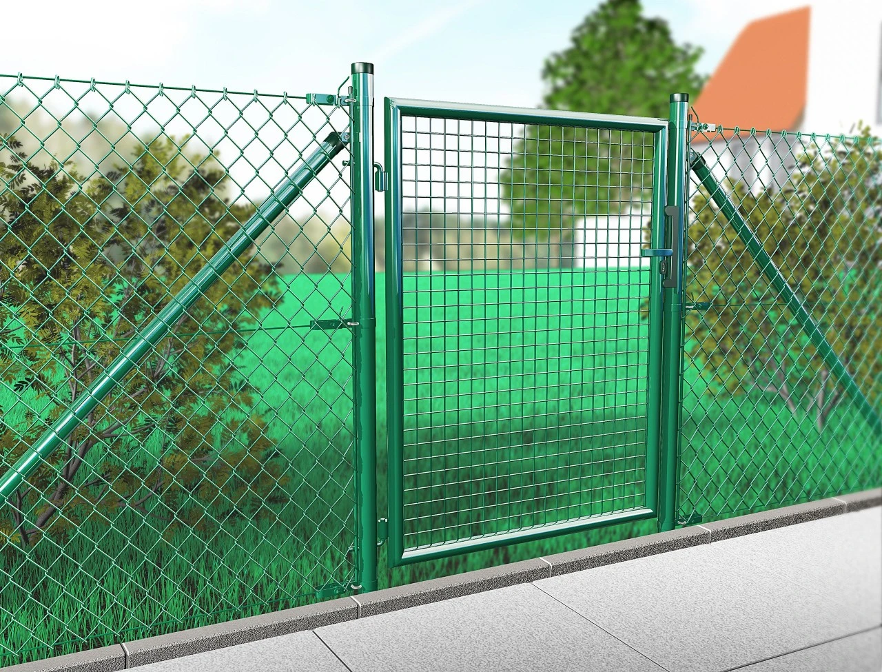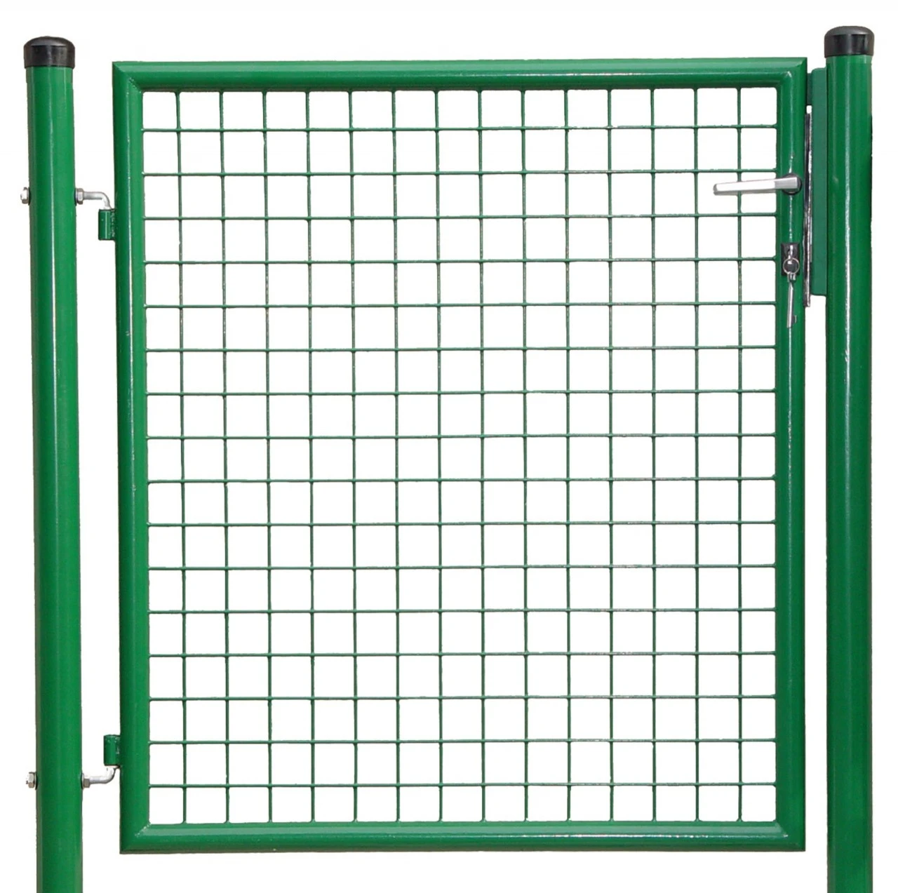 Forzinket, enfløjet hegnsport med grøn belægning. Rammer af runde stålrør jf. DIN 2394. Diameter ca. 40 mm, gitter ca. 50/50/4 mm, svejset. Almindelig dørlås, kan opgraderes med profilcylinder. Håndtag af plastikbelagt stål. Montagedele af rustfrit stål. Komplet med pæle af runde rør jf. DIN 2394, diameter ca. 60 mm. Gennemgangsbredde 100 cm.