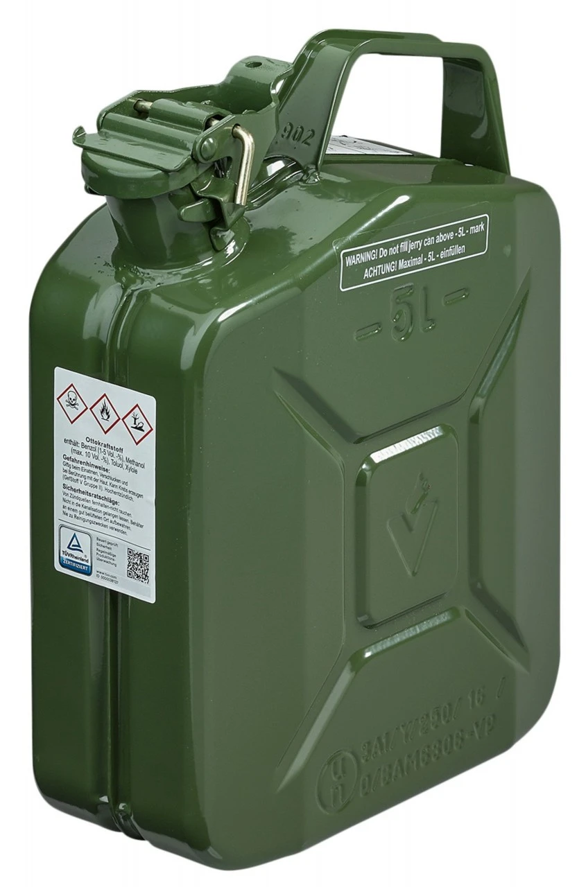 Med snaplåg, udluftning og benzinfast gummipakning. Indvendig og udvendig, brændstof-bestandig ovnlakering. UN godkendt af GGVS. Farve: olivengrøn.