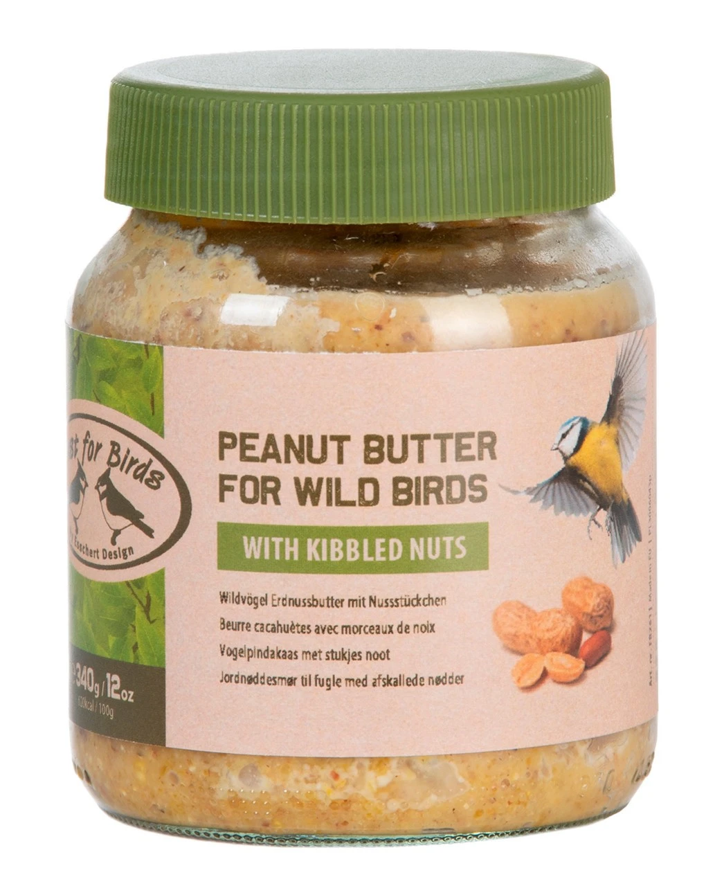 Den lækre mad til vilde fugle på alle årstider. Med nøddestykker. Især ideelt om vinteren, når fuglene har brug for mere fedt. Glassets låg er lavet af genbrugsplast, og blæketiketten er vandbaseret. Passer til jordnøddesmørhuset (nr. 75-382). Indhold 340 g. Vægt 535 g.