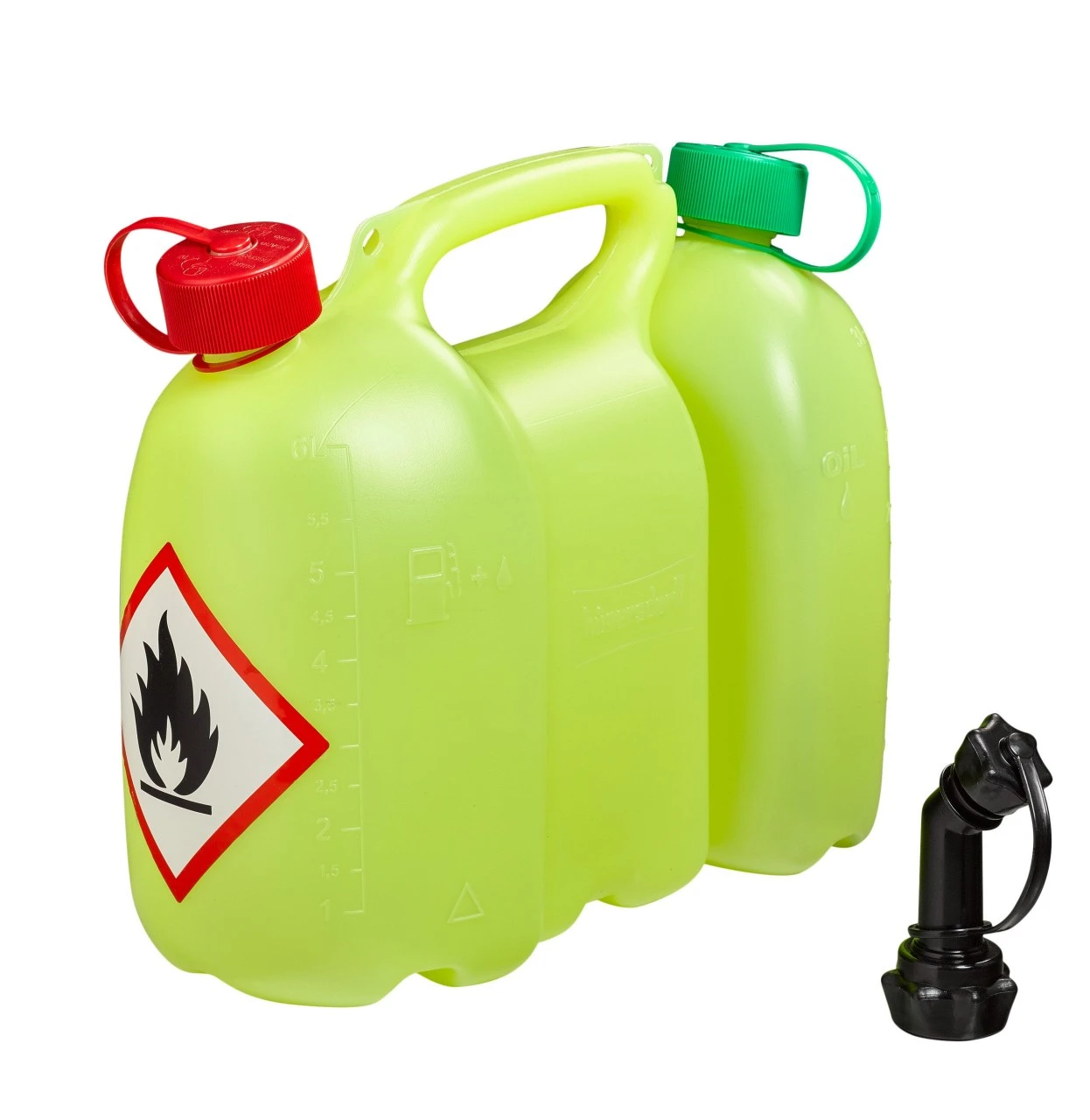Af polyethylen, 6 liters dunk til benzin og 3 liters til olie. Leveres med 2 skrue låg og sort hældetud. Med UN-lukning efter GGVSE. Vægt 1070 g. Gul-transperant
