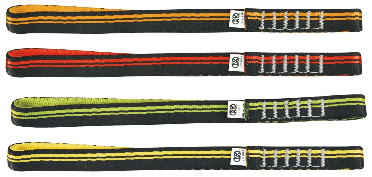EN 566. Ekspressslynge, f.eks. B. til brug som et forbindelseselement i redningsoperationer. Længde 12 cm. Bredde 15 mm. Brudstyrke : 23 kN. Vægt 10 g. Farve blandet.