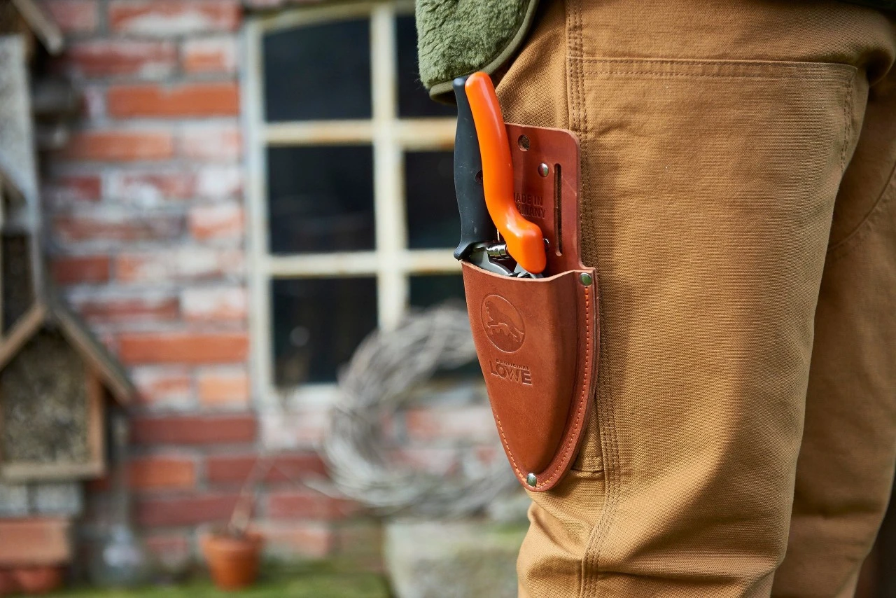 Löwes Premium læderkogger til håndsakse er lavet af robust læder og er 100% fremstillet i Tyskland. Det passer til alle Löwes håndsakse. Koggerets enkelte dele er syet og yderligere nittet for at imødekomme de høje krav til daglig brug. Bagside med øjer til bæltet. Mål 100 x 275 x 45 mm (L x B x H). Vægt 127 g.