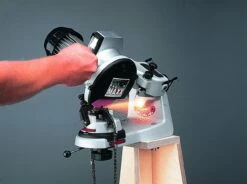 Normgivende for skærholdbarhed og evne af en savkæde er krombelægningen på skæretanden. Ved slibning er det derfor vigtigt at krom skæret bliver slebet gratfri og uden frynser. Maxx slibeapparate, med nye patenterede idéer, sliber højre og venstre skæretænder udefra og ind. Derved opnås altid optimalt fileresultat. Ad de mange indstillingsmuligheder kan alle gængse kædetyper slibes. Fastholdelse af kæden sker automatisk, når slibehovedet trykkes ned. Slibehovedet kan drejes til begge sider. Kædespændeslæde kan drejes og skubbes frem og tilbage. Indbygget belysning af slibestedet 230 Volt – 1,2 Amp. – 2950 Upm. Maxx monteres med 2 bolte på arbejdsbænken. Inklusiv 3 slibeskiver til kædetyperne 1/4″, .325″, 3/8″ og .404″