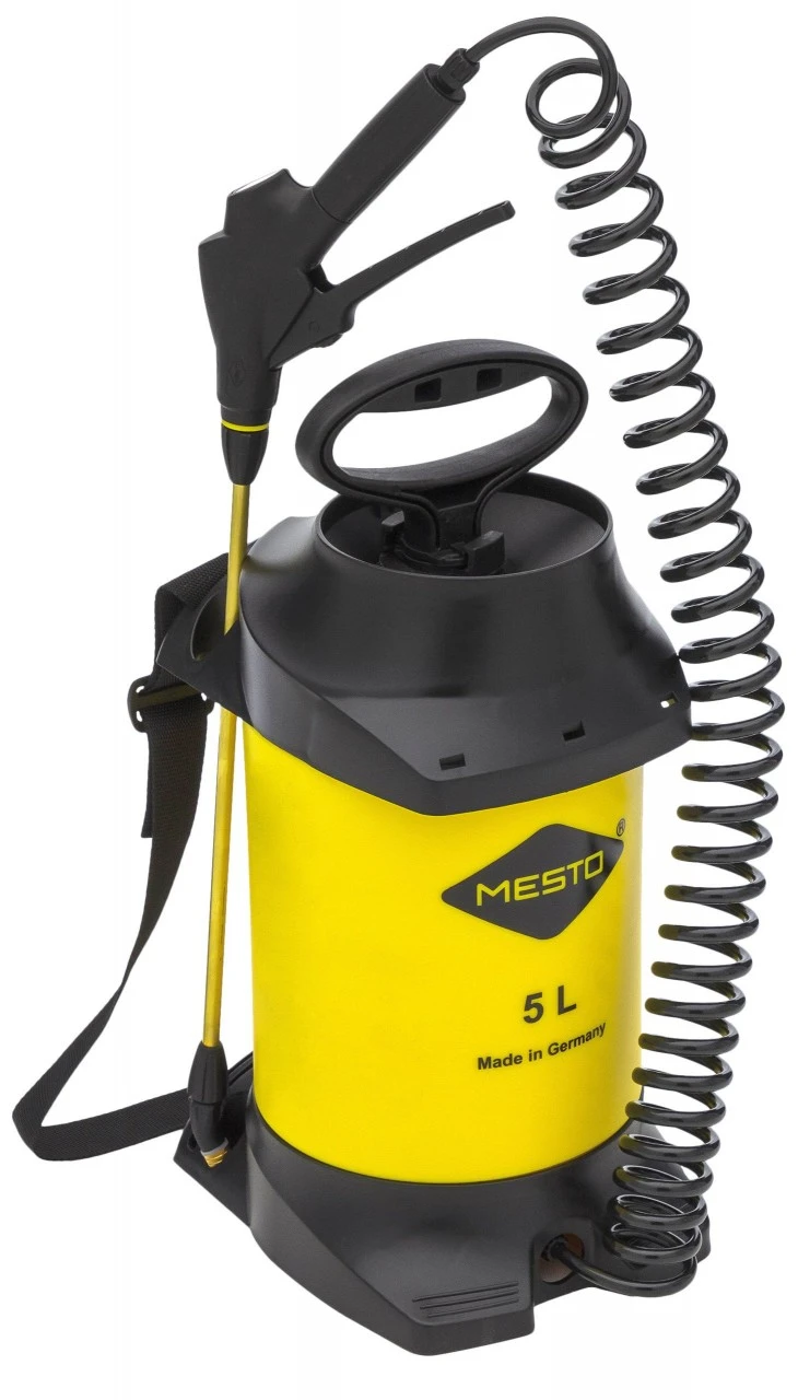 Skulder-bærbart sprøjteapparat med 5 liter fyldningsvolumen og 3 bar driftstryk inkl. ergonomisk formet håndtag med manometer og filter. Med 2,5 m spiralslange, 40 cm messing-sprøjterør, messing-hulkegledyse 1,1 mm og pakninger af kvalitets FPM, inkl. vægholder. Vægt 2,5 kg.