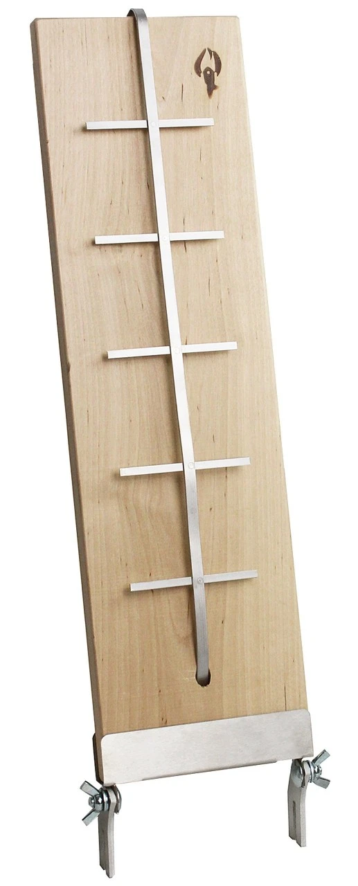En meget populær og hyggelig måde at tilberede laks på bålet er flammelaks. Sammen med vennerne ved grillen eller lejrbålet, tilberedt helt efter finsk tradition – dine gæster bliver begejstrede. Med fiskeristen af rustfrit stål kan laksen hurtigt og nemt klemmes fast på brættet. Varmen og røgen fra ilden gør laksen yderst aromatisk. Træet (mål 50 x 14 x 2 cm) af finsk birk er varmebehandlet og giver laksen en særlig note. Holderen af rustfrit stål (åbningsbredde 5 mm) stikkes ganske enkelt på kanten af en bålskål eller grill. Vægt 2400 g.