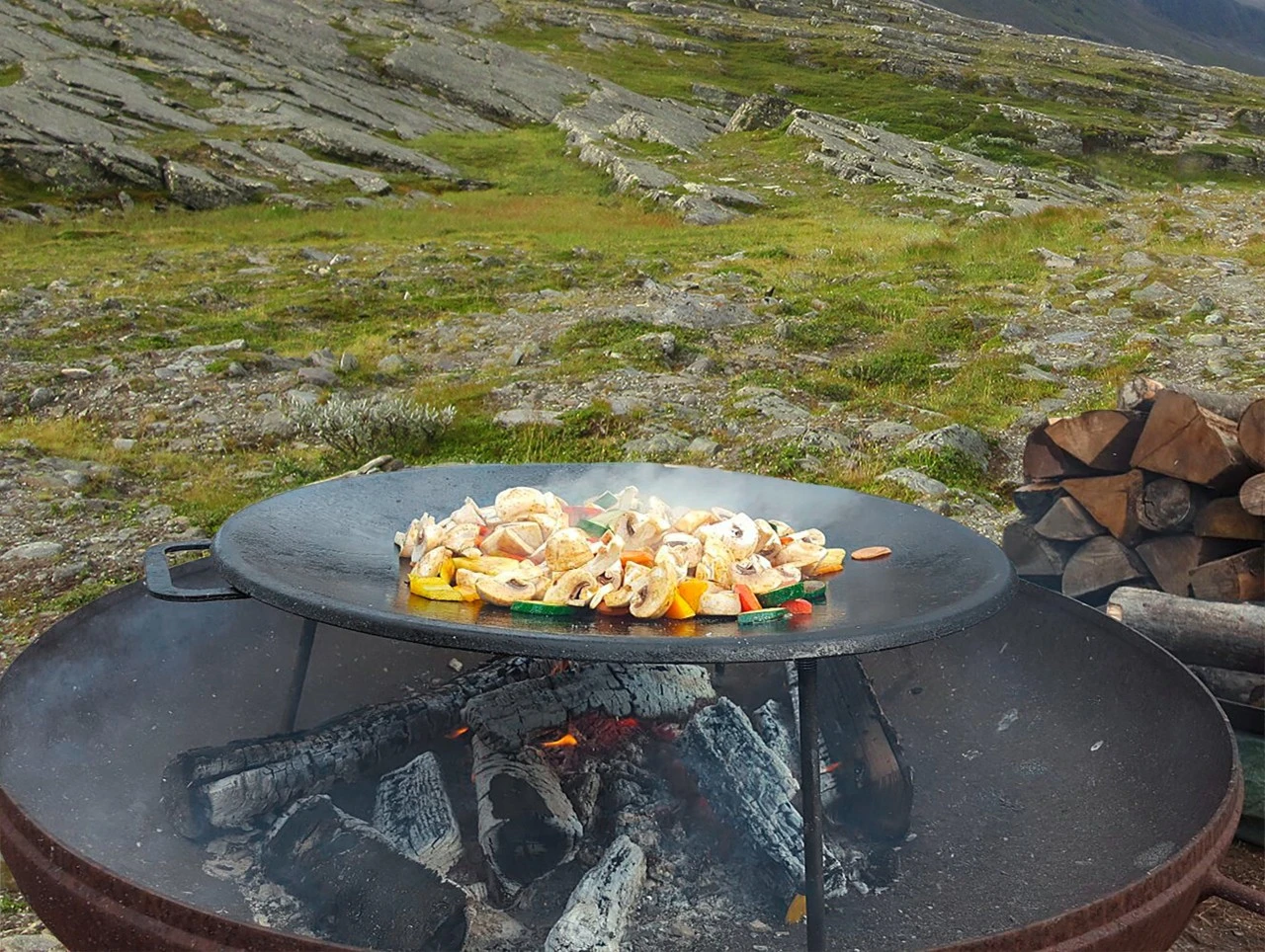 Finsk pande til åbent ildsted. Let at samle, 3 ben, der skrues på .Noget smør eller bacon på panden og hurtigt haves en ret til 7-8 personer.