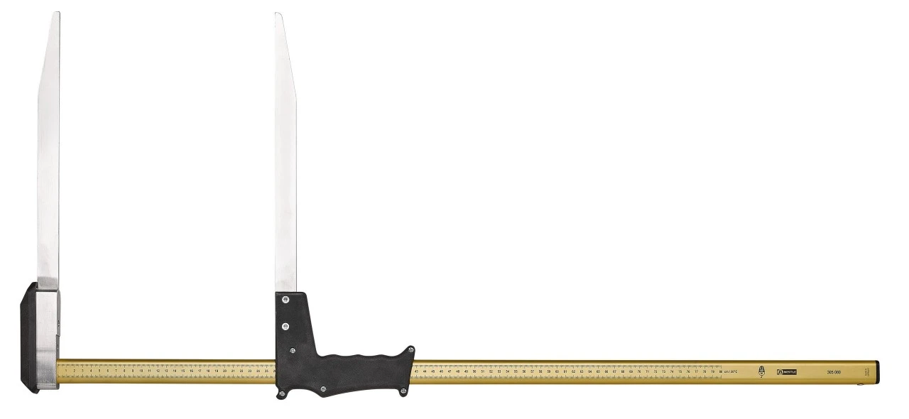 Kvalitets-kluppe, måleskinne af aluminium-hul-ovalprofil, 30 x 15 mm. Måleinddeling i centimeter og millimeter. Tallene er trykt i sort og i flugt med overfladen, slidstærke. Bevægelige skydere med leje og hoved, der kan efterjusteres. Skyder af slagfast polyamid, kæber af aluminiumsprofil. Måleområde 80 cm, vægt 1000 g.