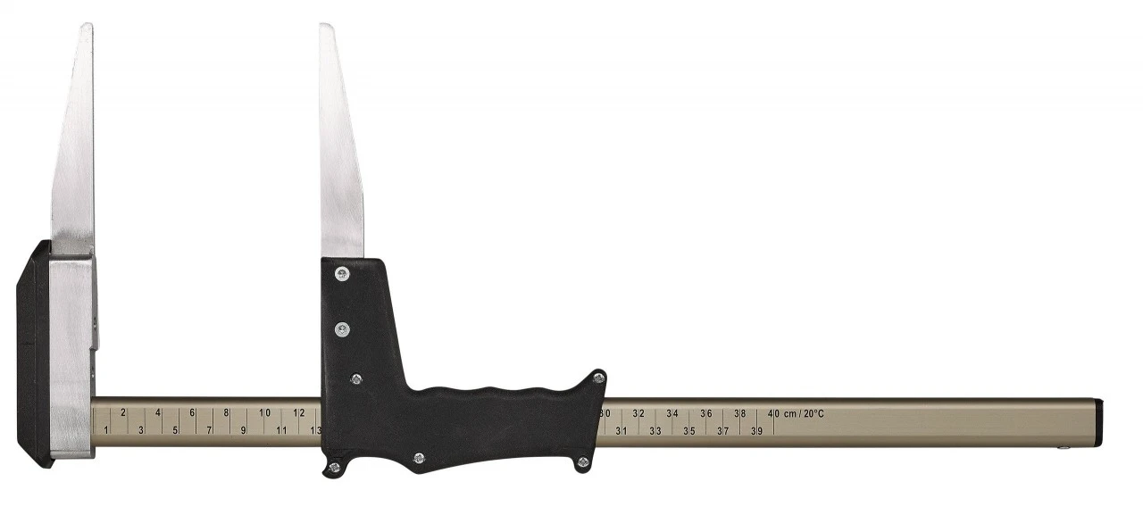 Målekluppe med ekstraordinær stabil, oval skinne og forbedret, slagfast polyamid-skyder og svejsede aluminiums-måleben. Håndtaget med fordybninger til fingrene er ergonomisk optimeret; det ligger godt i hånden og styres sikkert uden efterjustering og uden at vippe. Den anodiske film forhindrer afslidning af tallene og er vejrbestandig; de dybsorte tal er også nemme at aflæse i tusmørke og viser de præcise måleresultater. Speciallegeringen er bøjningsfast, robust og modstandsdygtig.