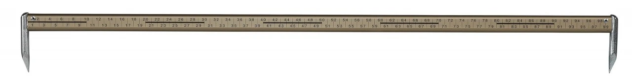 Måleskinne af aluminium ovalprofil, 30 x 15 mm, sort centimeterdeling på begge sider under guldfarvet, elokseret lag. Dobbeltsidet opmærkningskrog. Måleområde 1 m. Vægt 700 g