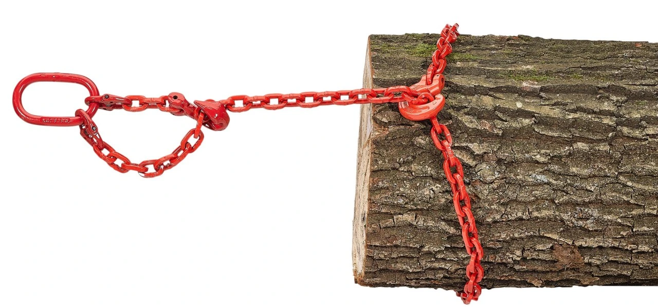 Firkantkæde med på den ene side ophængsled med forbindelsessjækkel og afkortningssæt med parallelkroge, på den anden slyngekrog.