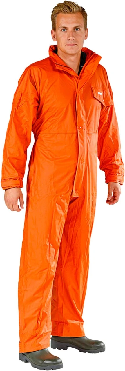 Kedeldragten Comfort Stretch fra Ocean er en vandtæt heldragt i et blødt og smidigt OEKO-TEX certificeret materiale, der er rivefast og kuldebestandigt. Regndragtens lynlås og knapper har et overfald i front samt en skjult hætte i kraven. Denne kedeldragt har en brystlomme, ærmer med elastisk manchet og velcrolukning samt lynlås og velcrolukning for justering af benvidde. Hold dig varm og tør i alt slags vejr med denne Ocean regndragt. 210 g/m2 Polyurethane belagt polyester.