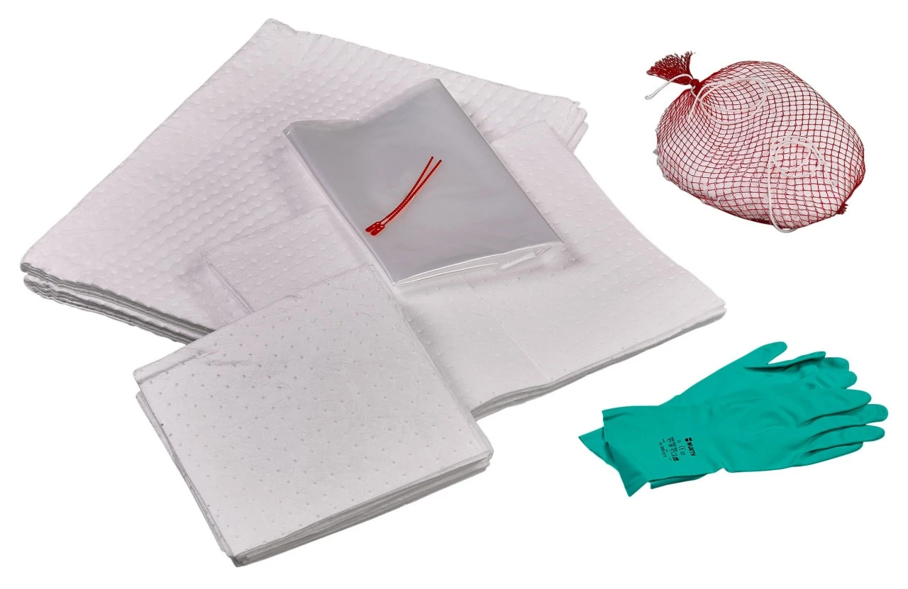 Indeholder: 2 absorberings ark 2 X 60 cm, 20 klude T-33, 10 klude T-200, 1 pude K-101, 1 par olie bestandige handsker, 2 stk. poser med bindebånd til bortskaffelse. Mål: ca. 60 X 60 X 12 cm, vægt 3 kg.