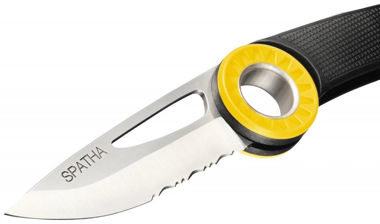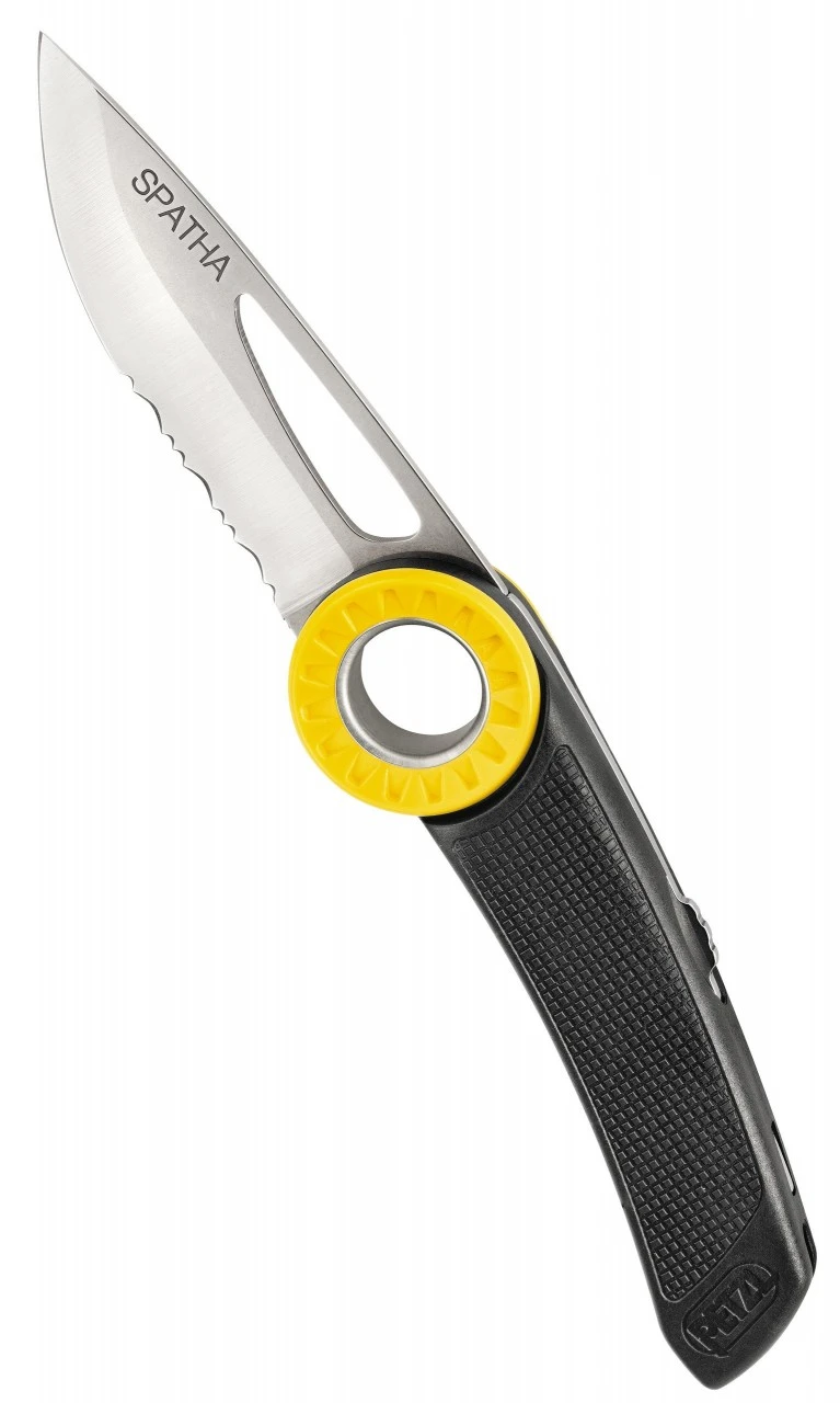 Petzl Spatha supplerer dit klatreudstyr med en kniv, som er let at åbne. Kniven har en øsken og kan hænges i karabinhage eller sele. Det tandede skær egner sig godt til overskæring af reb og statiske reb. Skæret kan også åbnes med handsker og låser i den åbne position. Skærets længe: 60 cm. Fremstillet af rustfrit stål. Greb i polyamid. Lukket længde: 115 mm. Åben: 175 mm. Vægt 43 g.