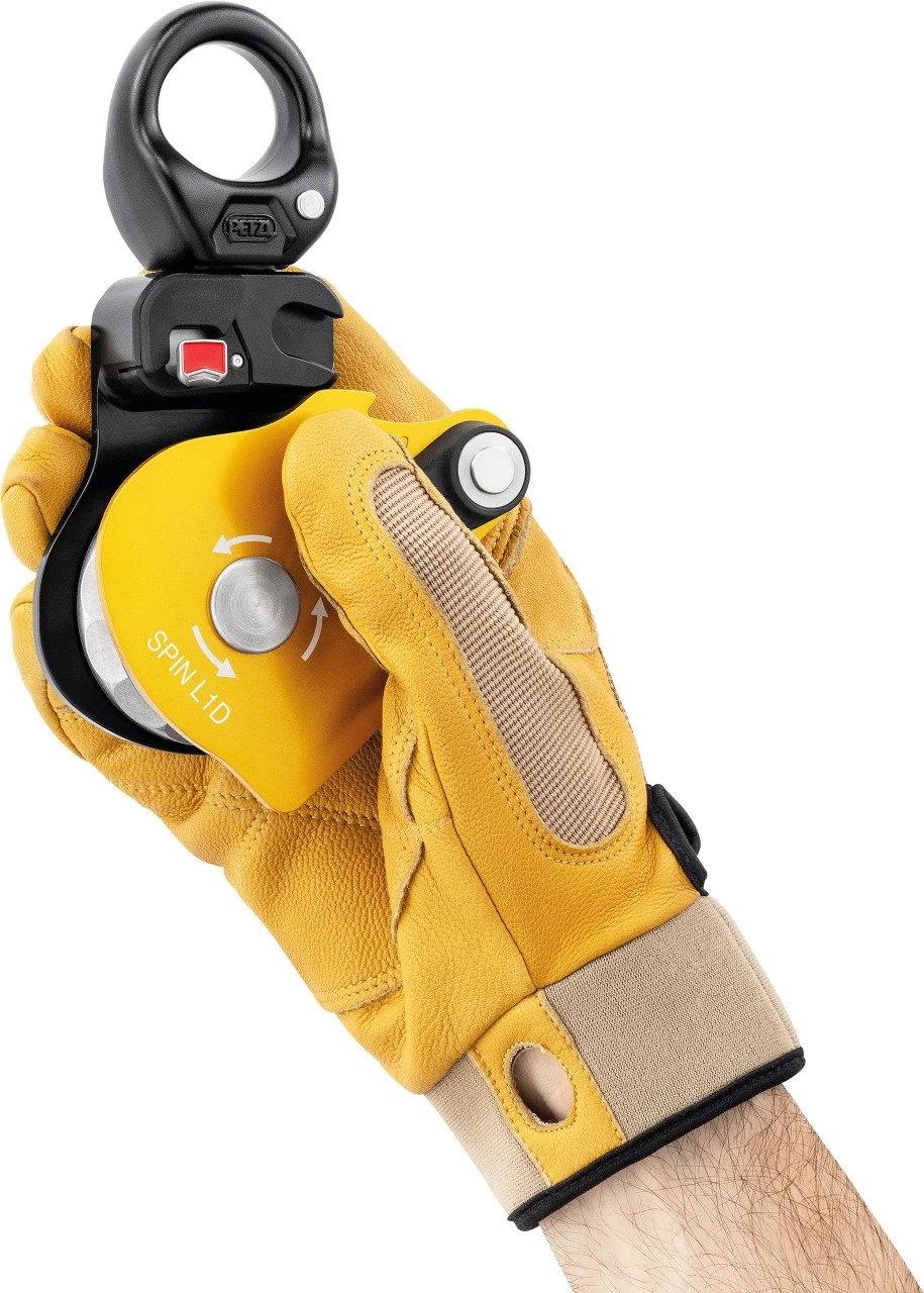 Petzl Spin L1D er en trisse, der er særligt velegnet til afbøjning af tung last. Kasteblokken er designet således, at rebet kun kan bevæge sig frit i den markerede retning. I den anden retning, sikrer formen på rebets løbeflade store bremsekræfter på rebet, hvilket gør taljen, sammen med andet rapelleudstyr, ideel til sikker nedfirring af last. Petzl Spin L1D har en rød indikatormarkering, der visuelt advarer om en lås, som er lukket forkert. Et drejeled øverst på kasteblokken sikrer optimal positionering. Karabin, reb eller slynger er velegnede som løftegrej.