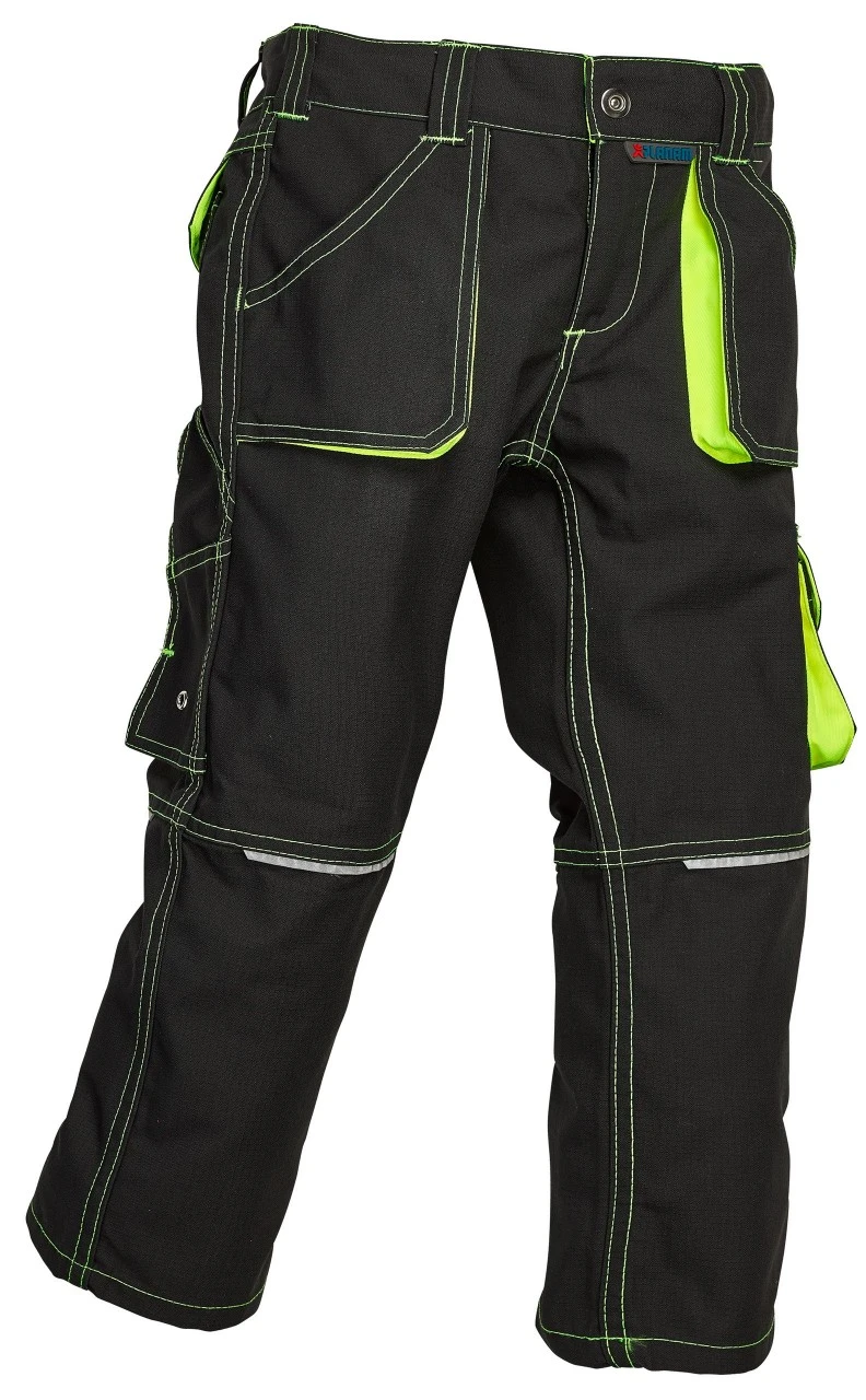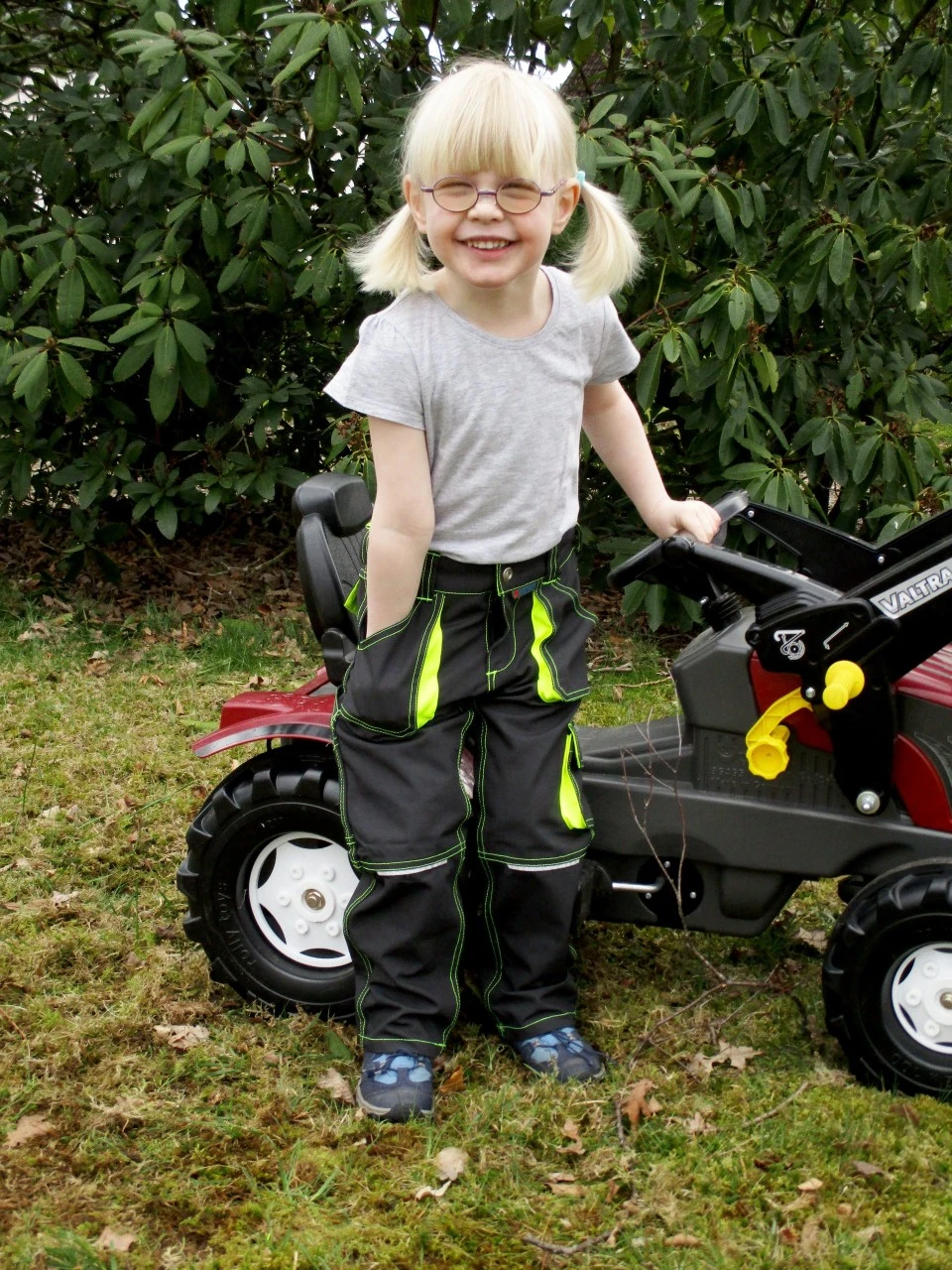 Junior-arbejdsbukserne er lavet af et let, forureningsfrit og blandet stof, der følger Øko Tex Standard 100. Den er slidstærk, let at pleje og tilbyder UV-beskyttelse med solbeskyttelsesfaktor 80. Takket være det reflekterende 3M Scotchlite, kan dit barn også ses ved dårlige vejrforhold. To påsyede stiklommer, lårlomme med klap og knap til venstre, dobbelt tommestoklomme til højre, justerbar elastisk snøre i taljen, lynlås i slidsen, linning med bæltestropper og trykknap, to påsyede baglommer med velcrolukning. 260 g / m².