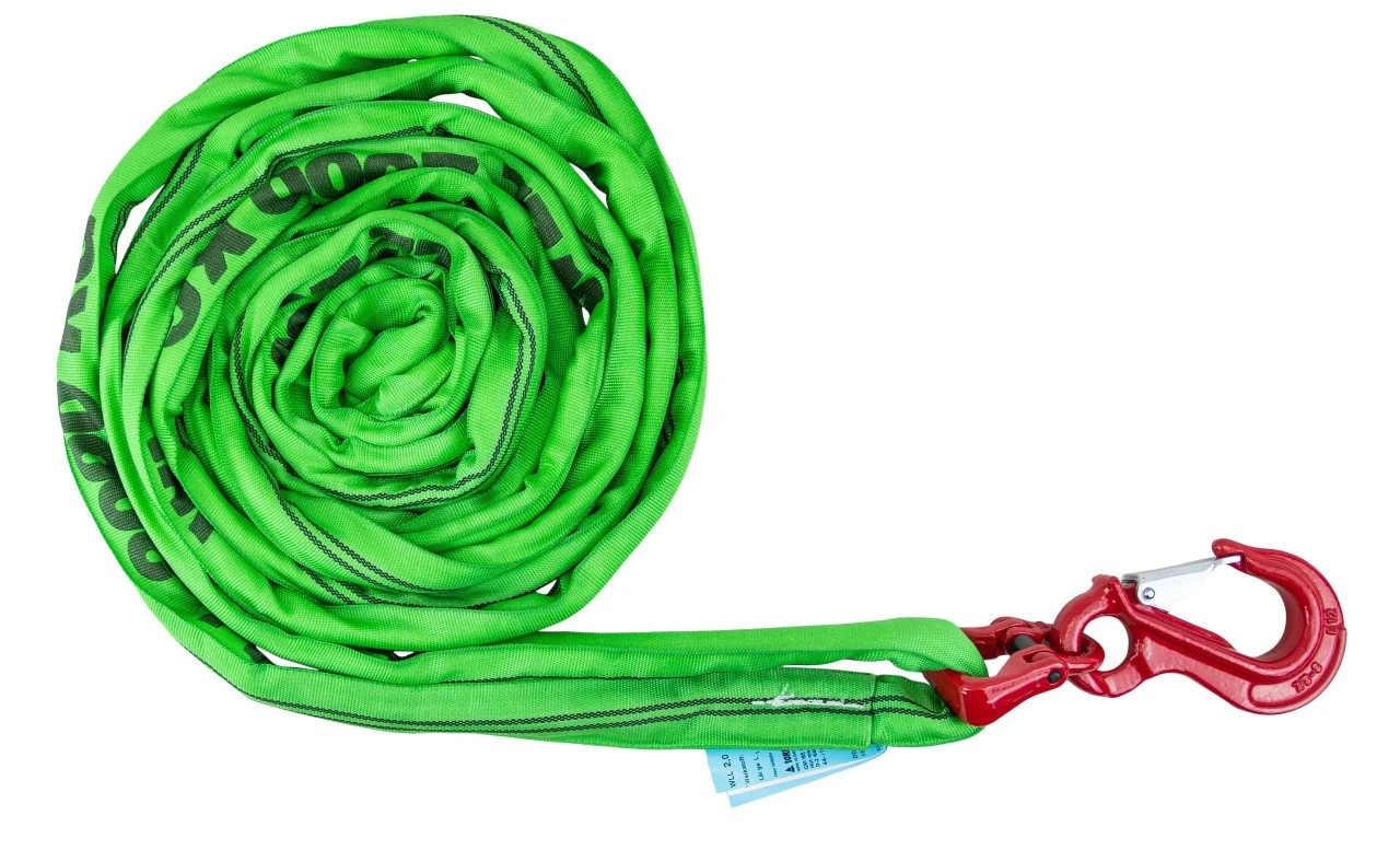 Denne polyester-rundsling har en indarbejdet Sika-krog til forankring af et wirespil. Rundslingen føres rundt om træet gennem fastgørelsesøjet på spillet, og enden af rundslingen fastgøres med krogen.