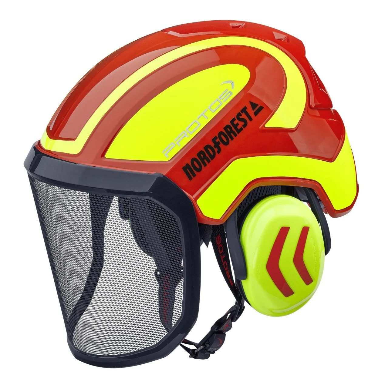 Protos Integral Arborist, rød-neongul, er et hjelmsæt, som passer specielt til træklatrere. Hjelmen, der er certificeret iht. EN 397 og EN 12492, sidder godt og sikkert på hovedet, selv under vanskelige klatremanøvrer. Det skyldes den innovative størrelsesjustering og den velgennemtænkte styring af hageremmen omkring høreværnet. Alle klatrehjelmens beslag er placeret indvendigt, så de ikke kan fanges i grenene. CrashAbsorber øverst under hjelmskallen femdobler stødabsorberingen og gør stødpåvirkninger synlige. Nakkebeskytteren strækker sig langt ned, mens ørekapslerne, der permanent sidder tæt op ad hovedet, forbedrer den beskyttende effekt bag på hovedet. Trykket i det EN 352-3-certificerede høreværn kan justeres afhængigt af behov. Visiret F39 iht. EN 1731 består af ætset metal og har over 39 åbninger pr. kvadratcentimeter. Det holder også fine spåner tilbage, og det er ekstra transparent og forsynet med et bredt synsfelt og en gummitætning, der beskytter mod fremmedlegemer ovenfra. De generøst dimensionerede, lukkelige ventilationsåbninger sikrer masser af komfort, både om sommeren og vinteren.