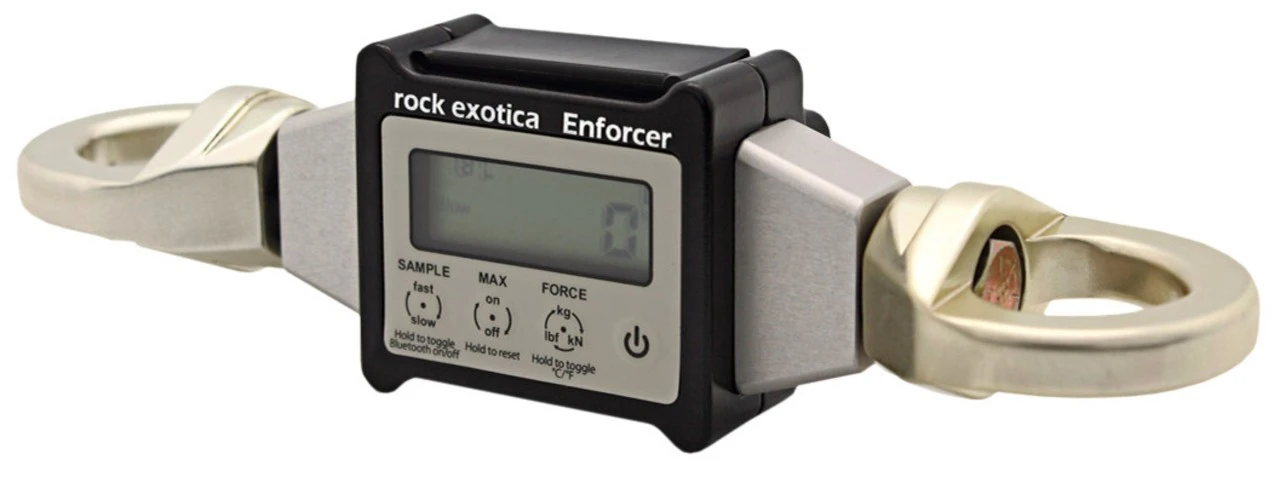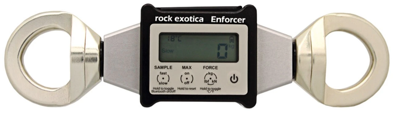 Enforcer er en særlig let og kompakt belastnings- og lastcelle fra Rock Exotica. Udstyret med to ryghvirvler justerer trækkraftmåleren sig altid optimalt og forhindrer, at rebene sno sig.