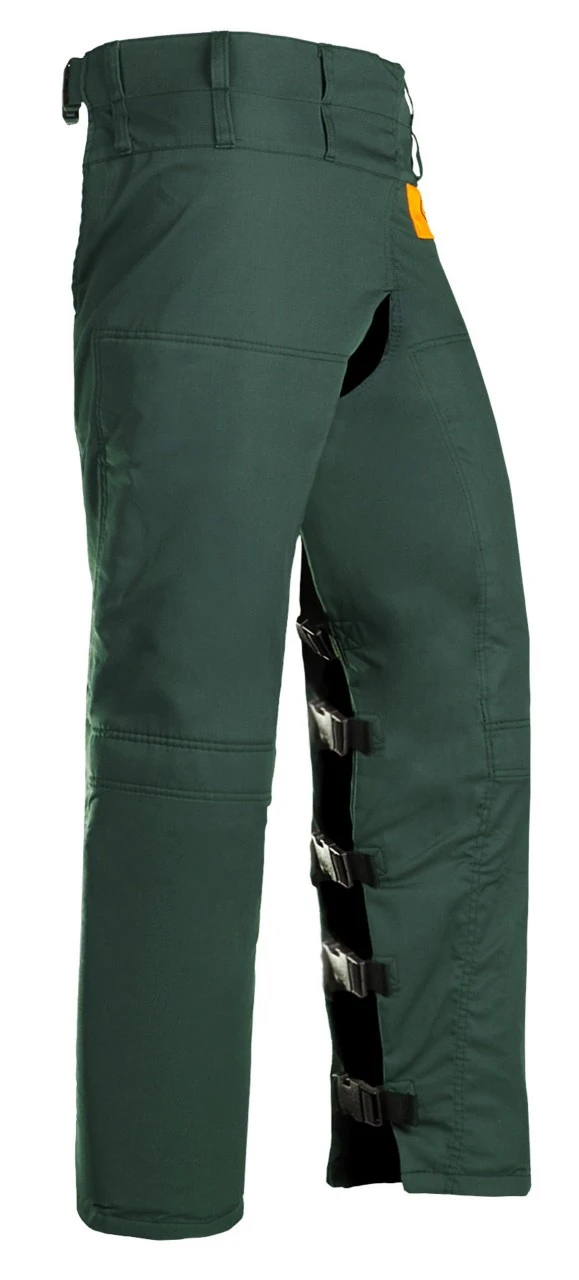 Meget robust yderstof Skæreresistent indlæg med ekstra stærke fibre fra knæene til skridtet. Udtageligt, tæt, stødabsorberende, 6 mm tykt skum fra knæene til benmanchetterne. Let at tage af og på takket være til- og fraautomatik med klik. Lukning med elastisk rem og spænde. Med bæltestropper. Farve grøn-orange. En størrelse.