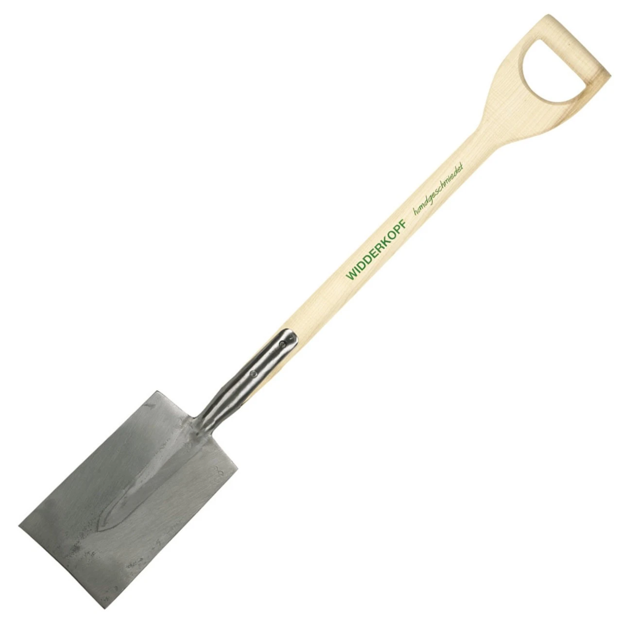 Ekstra kraftig spade til det grove. Skaft med aske-D-greb, 800 mm, Ø 48 mm. Skaftet er fræset ud af ét stykke og derfor med gennemgående årer. Nitten i rundingen i D-grebet går helt igennem. Bredde 170/180 mm, højde 290 mm, vinklet 30 mm. Længde: 1090 mm. Vægt 2900 g.
