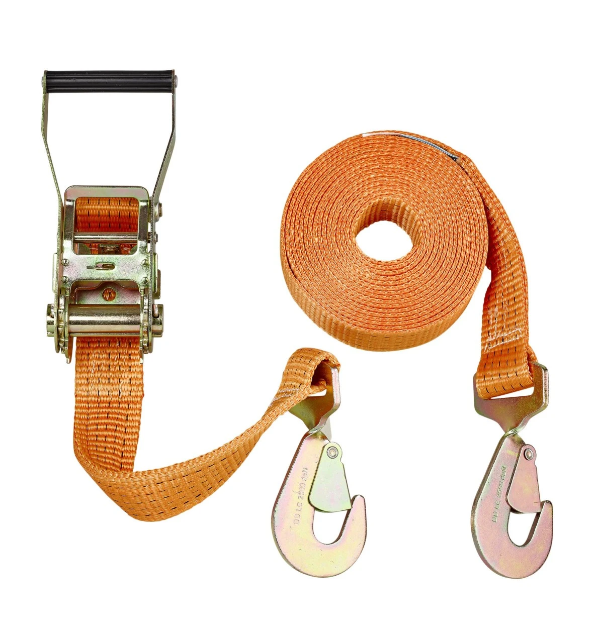 Materiale: polyester. Bredde 50 mm. Fast stroplængde ved spændedel 0,5 m. Opspænding 500 daN (ca 500 kg). Trækstyrke: direkte træk 2500 daN, i omkreds træk 5000 daN. Karabinkrog til fastgørelse i trækøjerne.