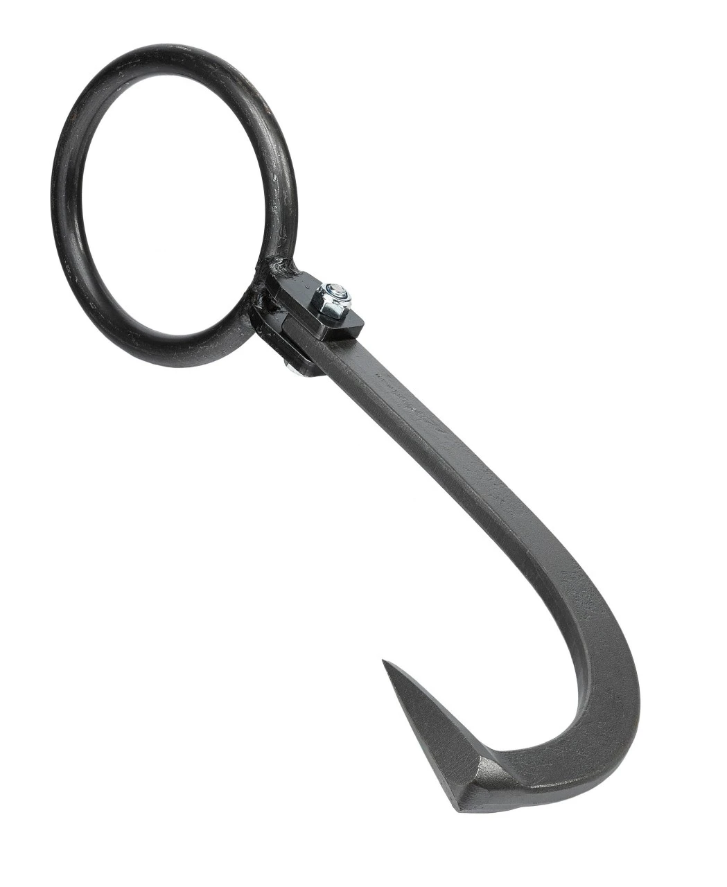 Til stort træ. Smedet krog med trekant-slebet spids, der holder godt. Ringdiameter 125 mm, total længde 500 mm. Vægt 1800 g