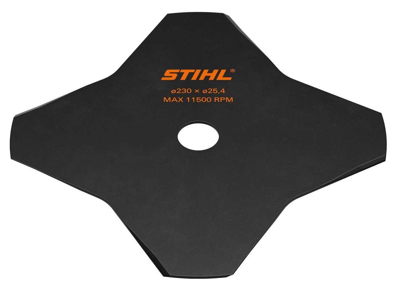 Græsklinge af stål med 4 tænder. Den klarer let omfattende opgaver i tykt og tørt græs samt kraftigt ukrudt. Også velegnet til siv eller tyndere buskadser.