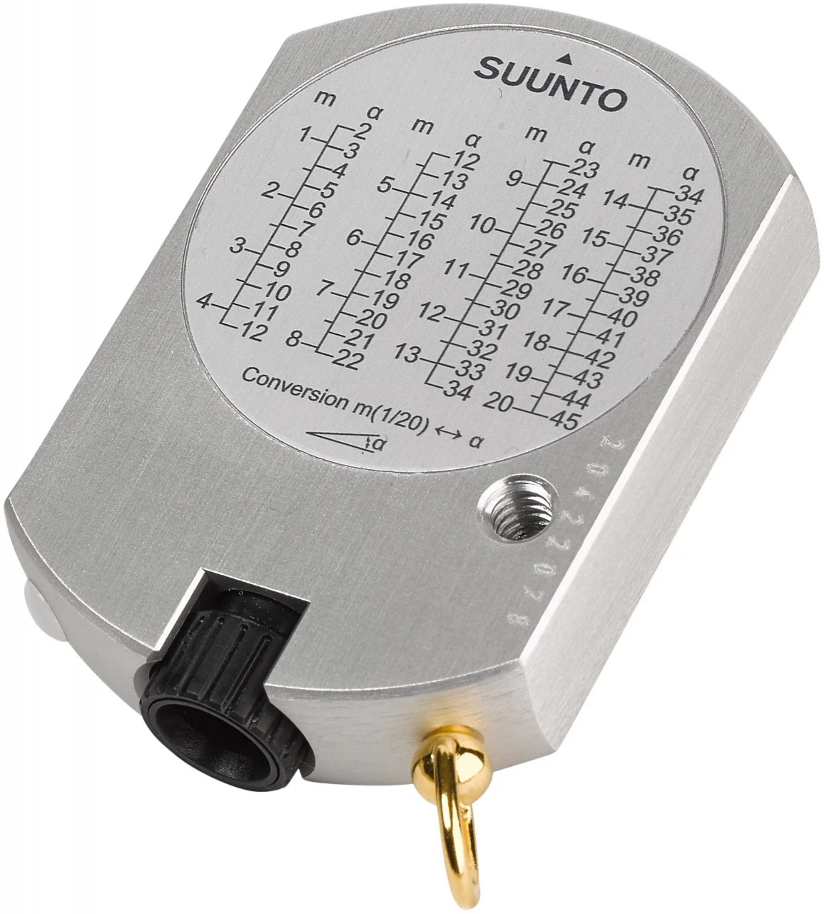 Suunto højdemåler. Præcis træhøjdemåler, specielt til udmåling af træhøjder. 2 skalaer til højdemåling ved 15 / (30), og 20 / (40) m. Omregningstabel for højdeaflæsninger mellem 0° – 45°. Aluminiumshus, væskedæmpet juvel-ophængning. Aflæsnings nøjagtighed 0,25 m. Mål 75 x 53 x 15 mm. Vægt 100 g.