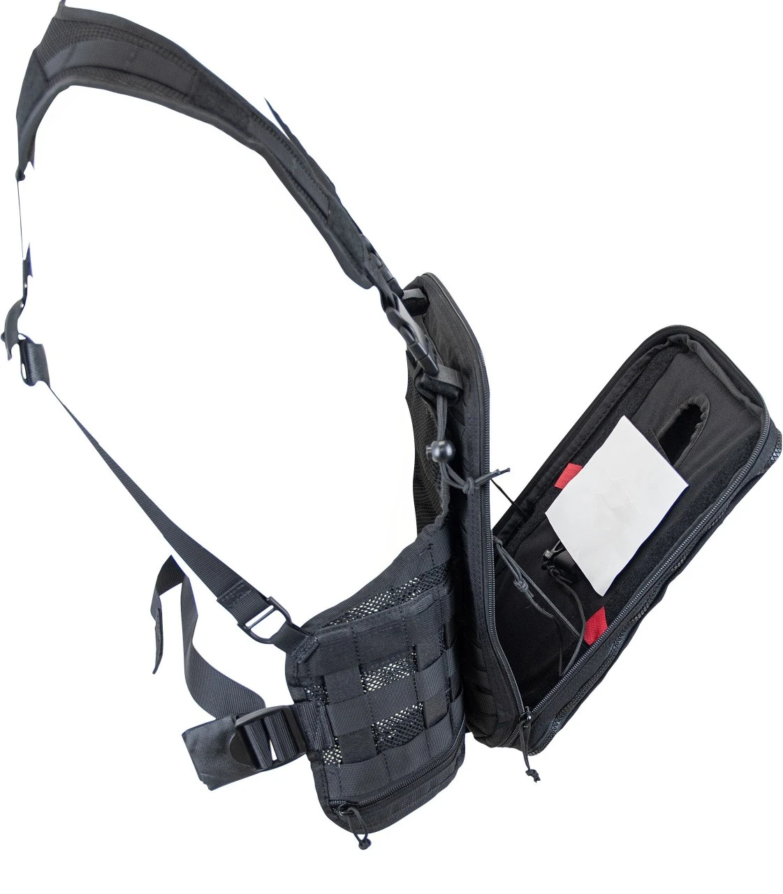 Table Ex Gear Ruxton Chest Pack L tabletholder er en taske, der bæres foran brystet, som er specielt designet til arbejdet med Tablets i marken. Det sikrer håndfrit arbejde og maksimal bevægelsesfrihed, samtidig med at der er hurtig adgang til tabletten samt alt andet arbejdsudstyr. Når man fastgør den foran kroppen, bliver holdningen ergonomisk, mens du altid har et godt overblik. Der er ingen grund til at tage en rygsæk på og af konstant, men kan stadig sagtens have en rygsæk på. Remsættet er ideelt til kortlægning, opmåling og andre registreringsopgaver, hvor man både har brug for meget udstyr og frie hænder. Det omfattende og fornuftigt opdelte opbevaringsrum til udrustningen gør dette bæresystem til en uundværlig ledsager i skoven. Arbejdsmaterialerne er altid tilgængelige, uden at bevægelsen begrænses. Det hængslede hovedrum er udstyret med en justerbar holder og er specielt optimeret til brug af tablets. Takket være den store stabilitet, som skyldes aluminiumsrammen, kan den kan også bruges som skrivebordsunderlag eller hylde. Table Ex Gear Ruxton Chest Pack L tabletholder er lige så hurtig at montere, som en normal rygsæk, og kan monteres individuelt vha. flere stropper. Det stabile materiale kan også bruges i ujævnt terræn, mens det gennemtænkte montagesystem sikrer udstyret godt og effektivt. Tabletter beskyttes mod at falde ud vha. velcro og magnetiske spænder, men kan stadig let kobles af systemet. Hovedrummets vinkel kan justeres løbende. Leveringsomfang: Tablet Ex Gear Ruxton Chest Pack L L Rem med tabletholder (maks. 32 x 22 cm), sort frontcover og monteringstilbehør til tablets. De omfattende udvidelser optimerer remsættet til krævende brug i marken, alt efter behov: