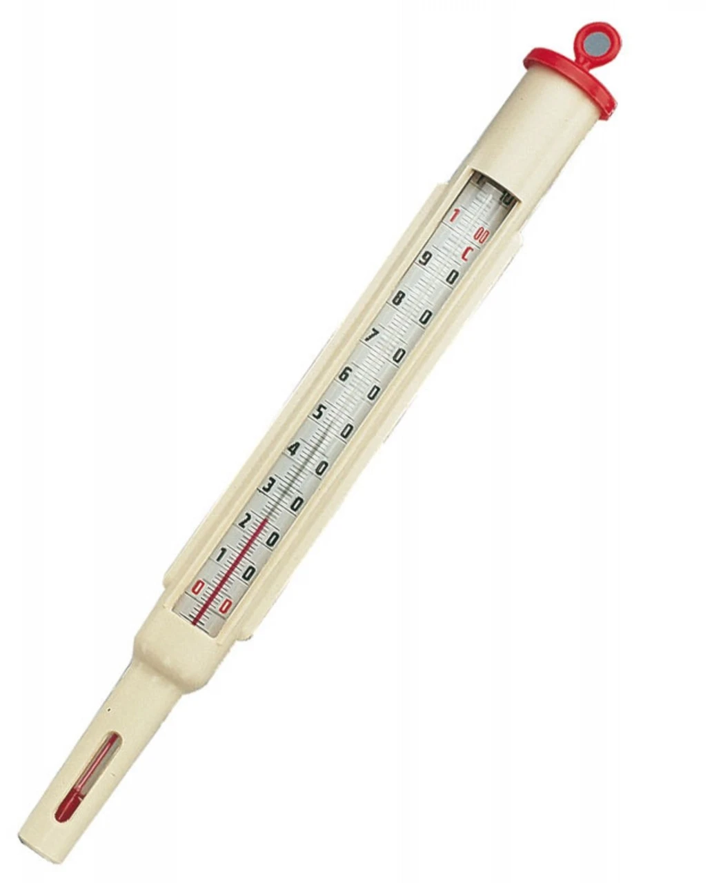 Velegnet til måling af vandtemperatur. Alkoholpåfyldning, med glascylinder i et plastikkabinet. Med løkke til ophæng. Måleområde –8 °C til + 100 °C. Længde 280 mm. Vægt 170 g.