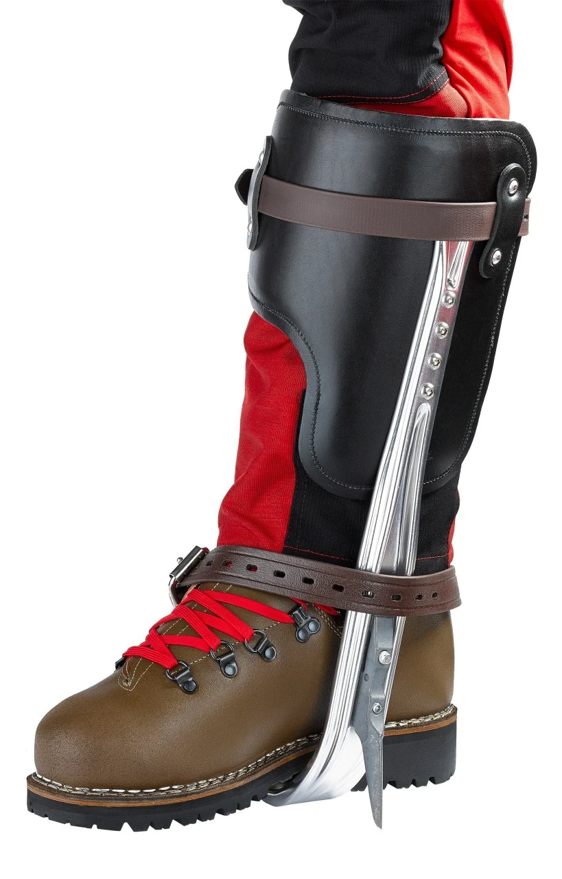 Med originale Weaver remme på fod og ben. Læderpolstring med tyk “schweizisk millitærlæder” på ydersiden og blødt natur læder på indersiden. Optimal tilpasning til benene. I læderpolstringen er indsat en elastisk skal af glasfiber med en råstfri stålplade. Derved er en drejning af klatrejernene praktisk taget udelukket. Resultatet er en perfekt pasform ved opstigning og stående arbejde.