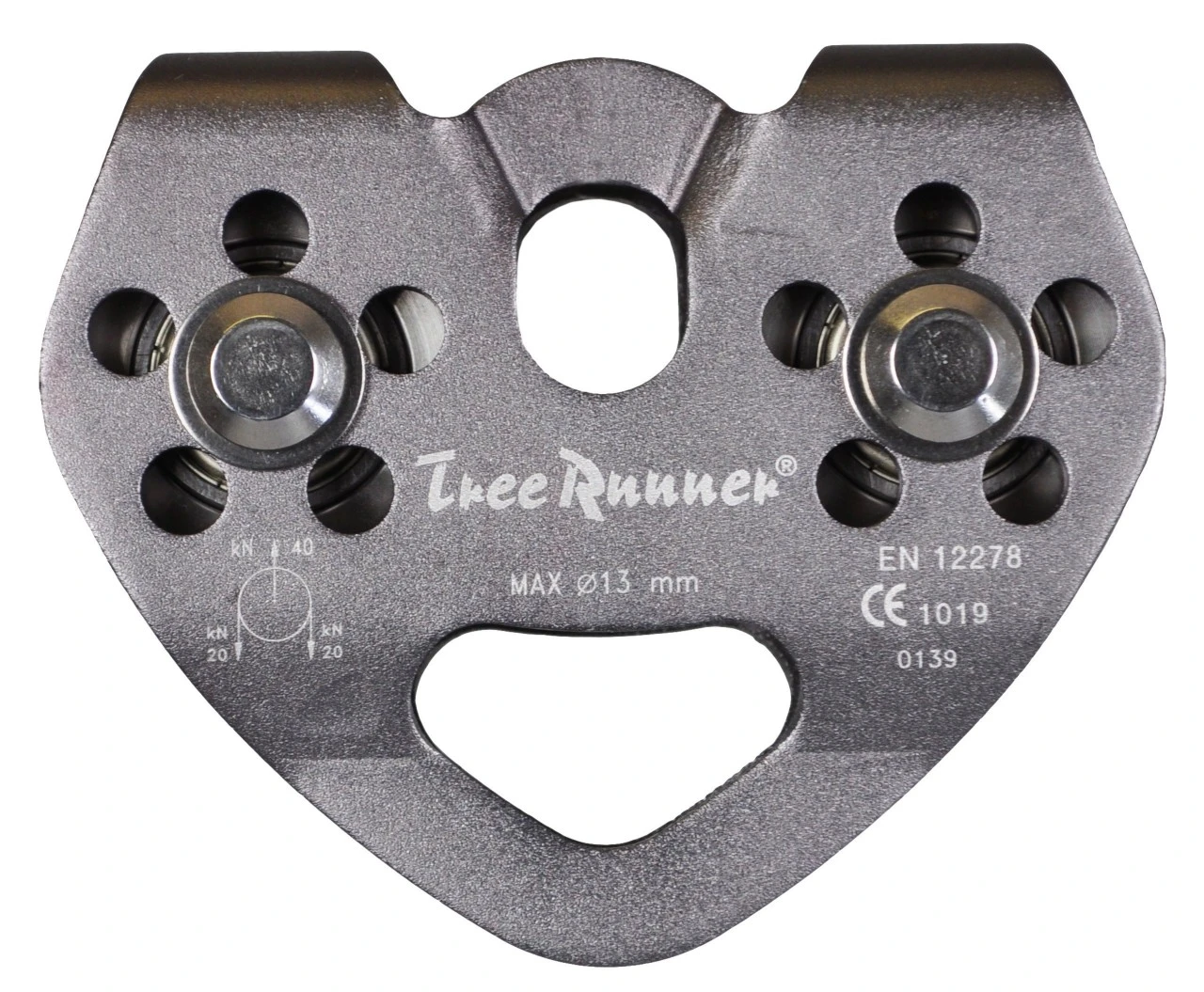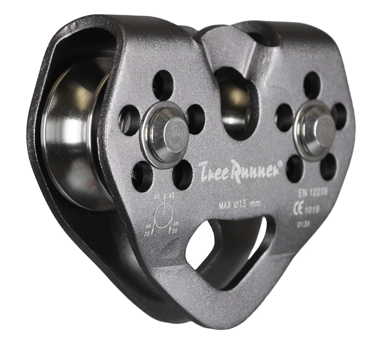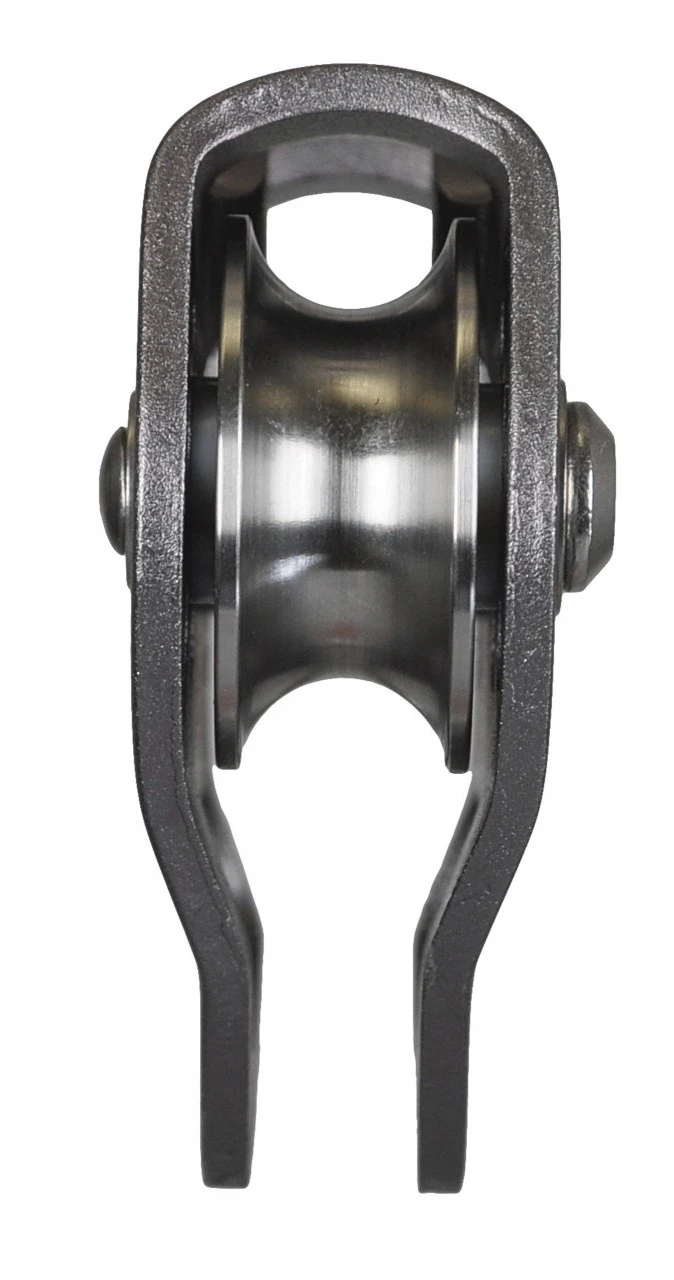 Stålrulle, kugleleje til stål- og kunststofreb op til 13 mm Ø. Brudstyrke 40 kN, nyttelast ca. 8 kN. Vægt 290 g.